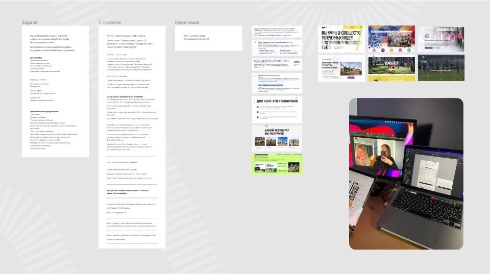 Главным визуальным референсом проекта стала фотография обычного спортивного стадиона: отталкиваясь от неё мы определили контрастное сочетание красного и зелёного (в котором ещё много дополнительных слоев и смыслов), а ещё плавные линии, которые дополнили графический стиль сайта.