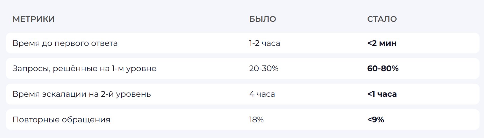 После внедрения решения поддержка стала работать заметно быстрее и стабильнее. Существенно сократилось время до первого ответа, поэтому пользователи получают реакцию почти сразу. Больше обращений теперь закрывается уже на первой линии, без передачи дальше по цепочке. Если эскалация всё же требуется, она происходит быстрее, чем раньше, поэтому сложные вопросы не зависают в очереди. Кроме того, снизилось количество повторных обращений, а значит, пользователи чаще получают корректное решение с первого раза. В целом это привело к более оперативной, качественной и предсказуемой работе поддержки.