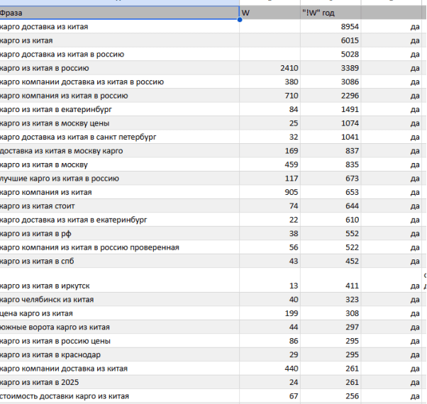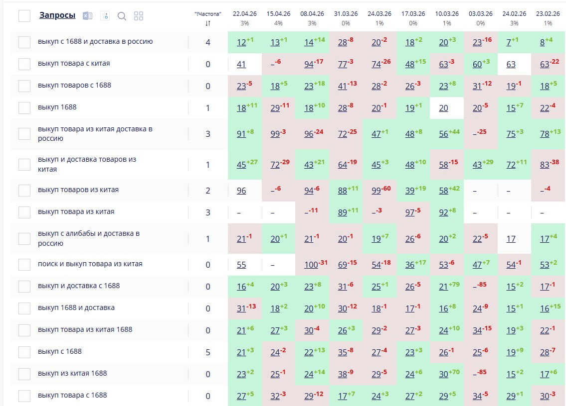 Следующим шагом стало семантическое ядро. Его собирали не формально, а с учетом конкурентов и коммерческих направлений проекта. По отчетам видно, что семантика включала запросы по поиску поставщиков, выкупу товаров, карго, работе с 1688, Alibaba, переводу денег и доставке из Китая. Позже семантика дорабатывалась по конкурентам.
