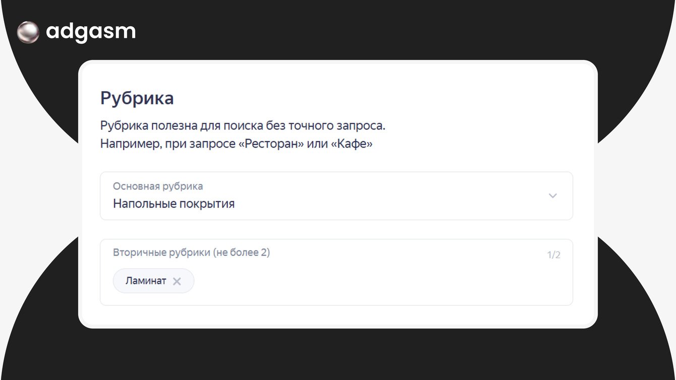 В стандартных настройках Яндекс Бизнеса функция оптимизации отсутствует, можно выбрать только рубрики: для BSPOL выбрали «напольные покрытия» и «ламинат». Несмотря на это, по части запросов мы не показывались вообще либо были очень низко в поисковой выдаче карт.
