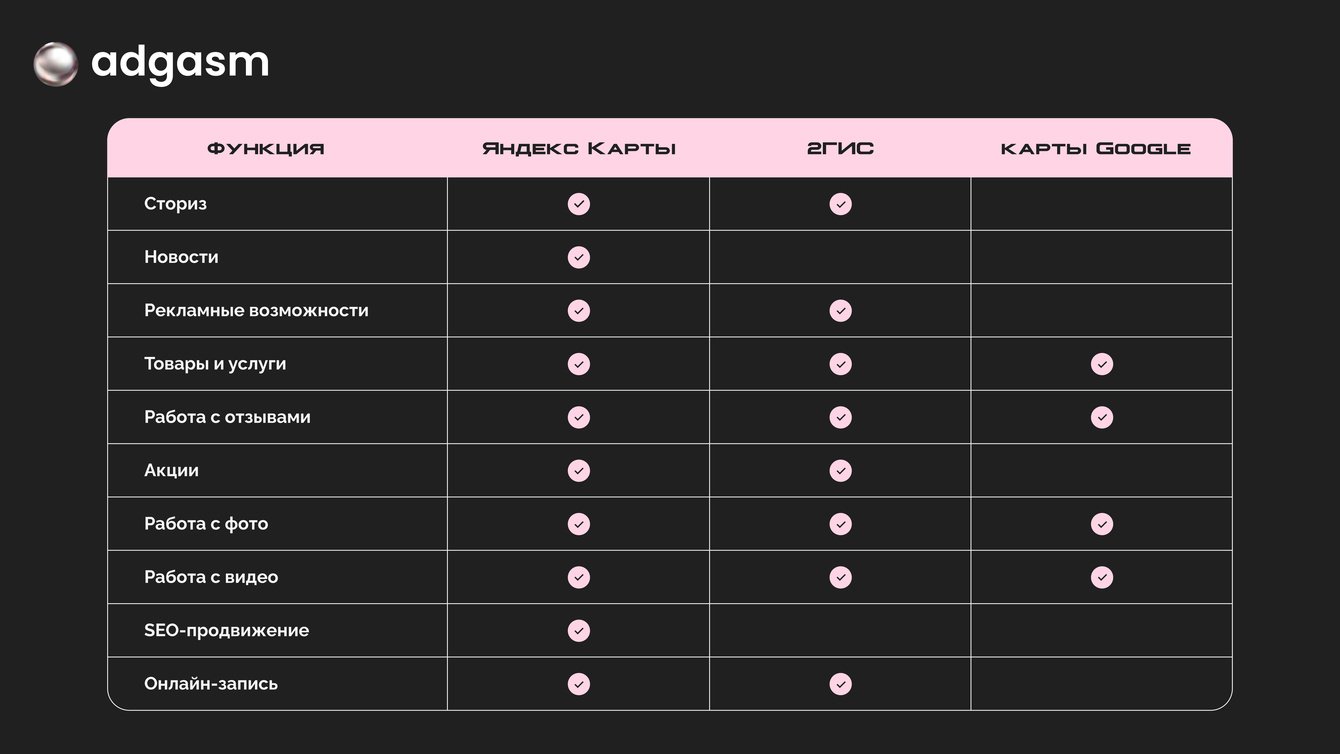 Мы фокусируемся на Яндекс Картах, поскольку он популярен, и у сервиса более широкий функционал для привлечения аудитории. Например, компании могут публиковать сторис, новости, акции, карточки товаров и услуг. Кроме того, только в Яндекс Картах бизнес может использовать SEO-продвижение.