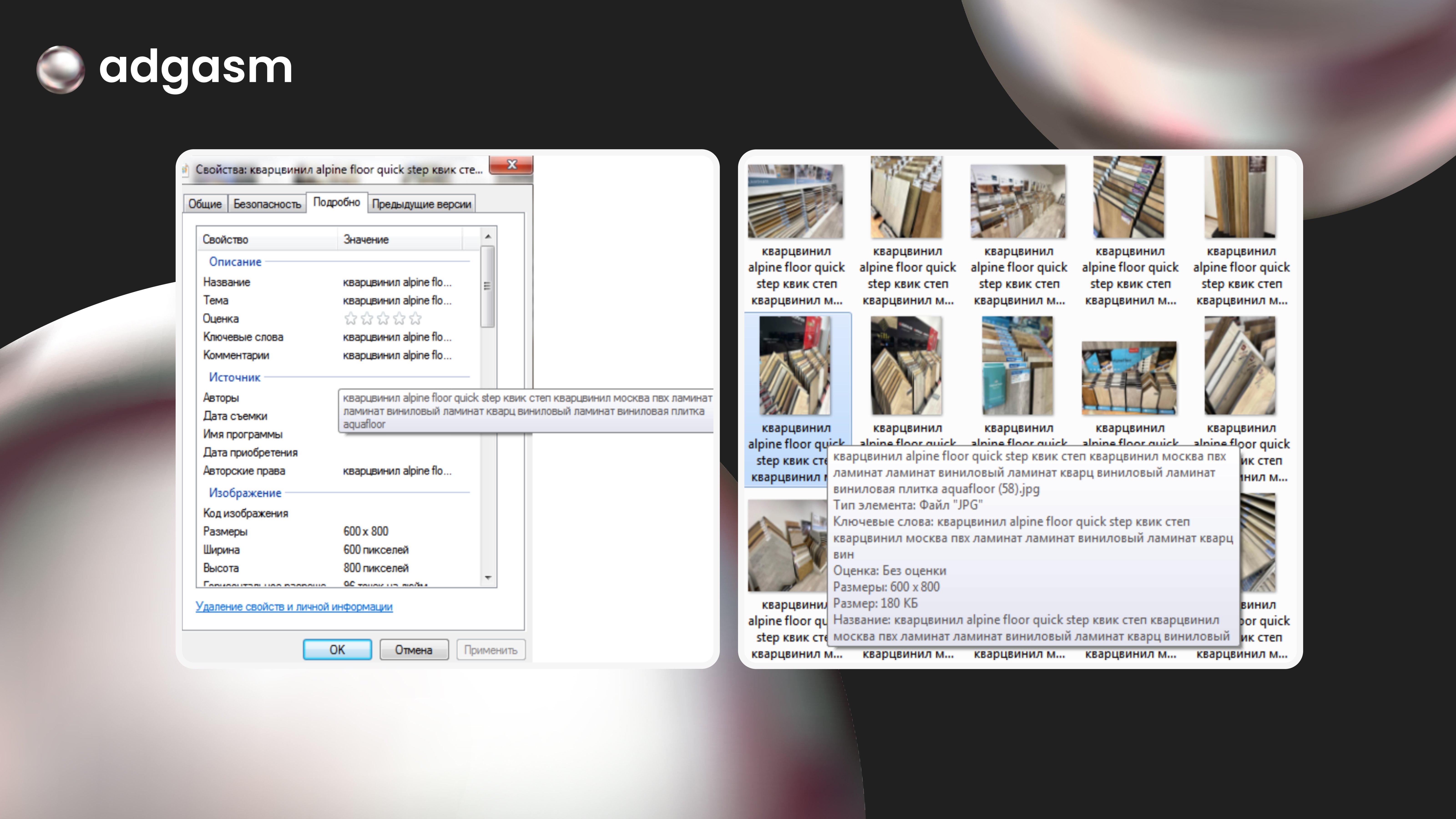 Мы добавили ключи в название каждого файла фотографий и во все поля значений в «свойствах» на компьютере. Выбрали ключи, по которым мы не показывались или попадали на низкие позиции.