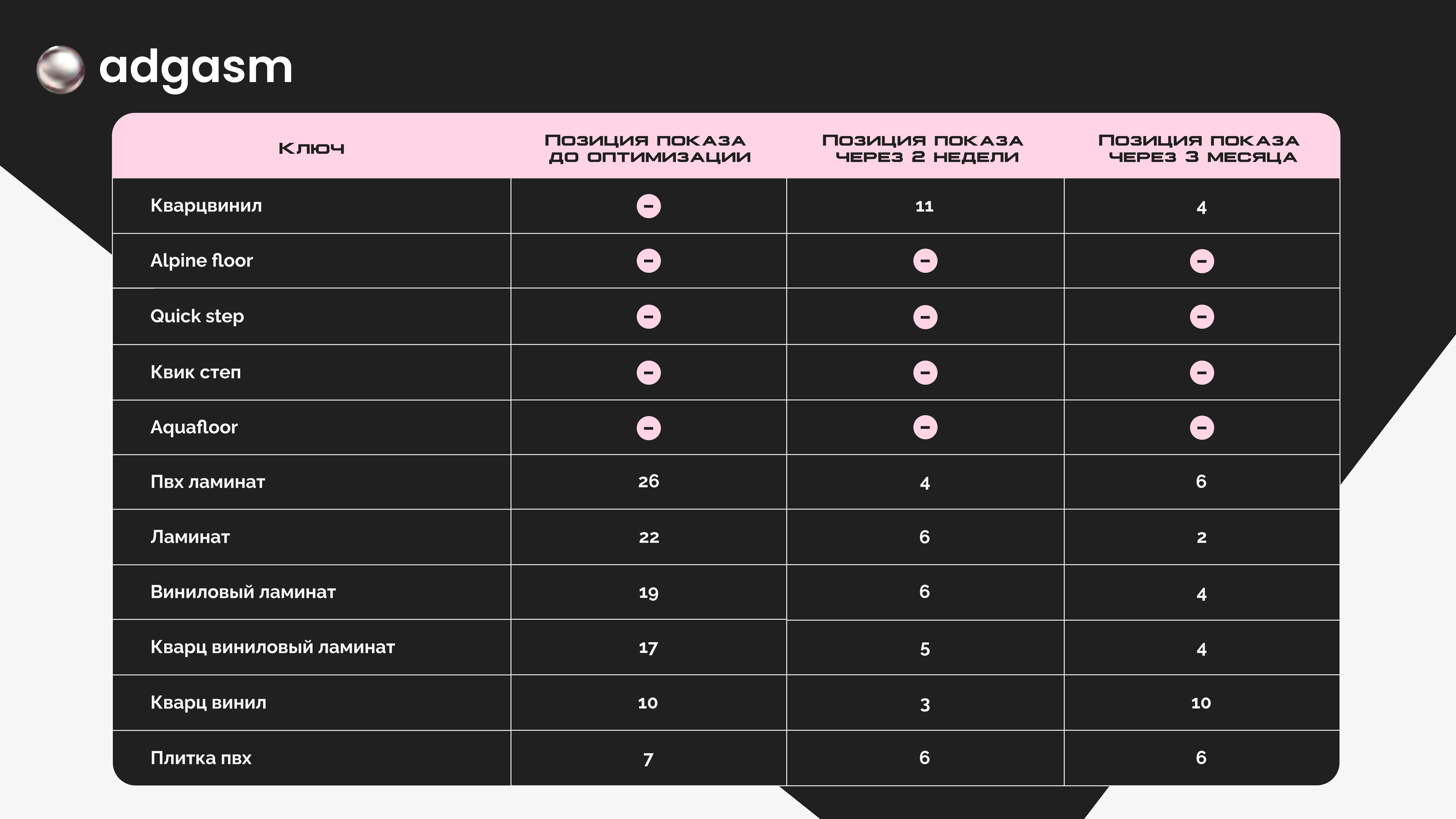 Но даже после проведенных работ компания не показывается по брендовым запросам фирм ламината. Скорее всего, это связано с тем, что по этим запросам в выдаче показываются только фирменные брендовые магазины “Alpine floor” и “Quick step”, “Aquafloor”.