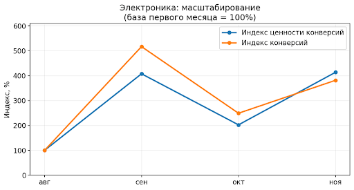 Для категорий с более высоким средним чеком ключ к быстрому росту — как можно раньше вывести в приоритет площадки с понятной аналитикой и сильной окупаемостью. Для категорий с более низким чеком — как можно быстрее накопить объем конверсий, стабилизировать стоимость заказа и только после этого ускорять масштаб.
