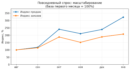 В более низком чеке системе требуется больше данных и больше конверсий, чтобы выйти на устойчивую экономику. Зато после периода обучения масштаб начинает нарастать быстрее за счет частотности спроса и снижения стоимости заказа.