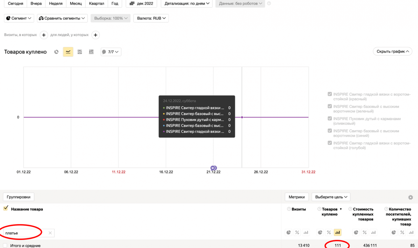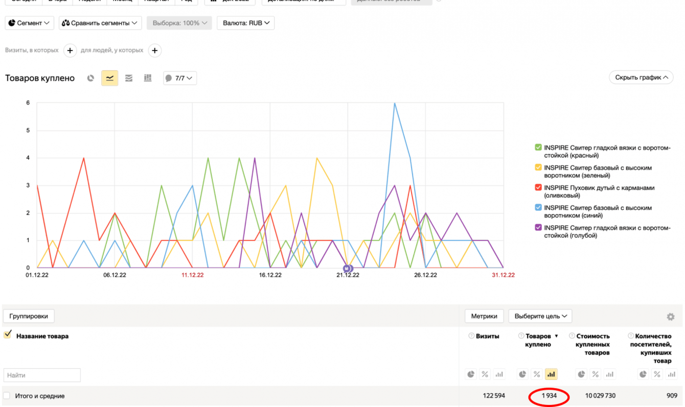 Например: в декабре покупка платьев составила 7% от общего числа, а большинство магазинов в этот период делают акцент на зимнии позиции забывая о других товарах. И упуская так заказы.