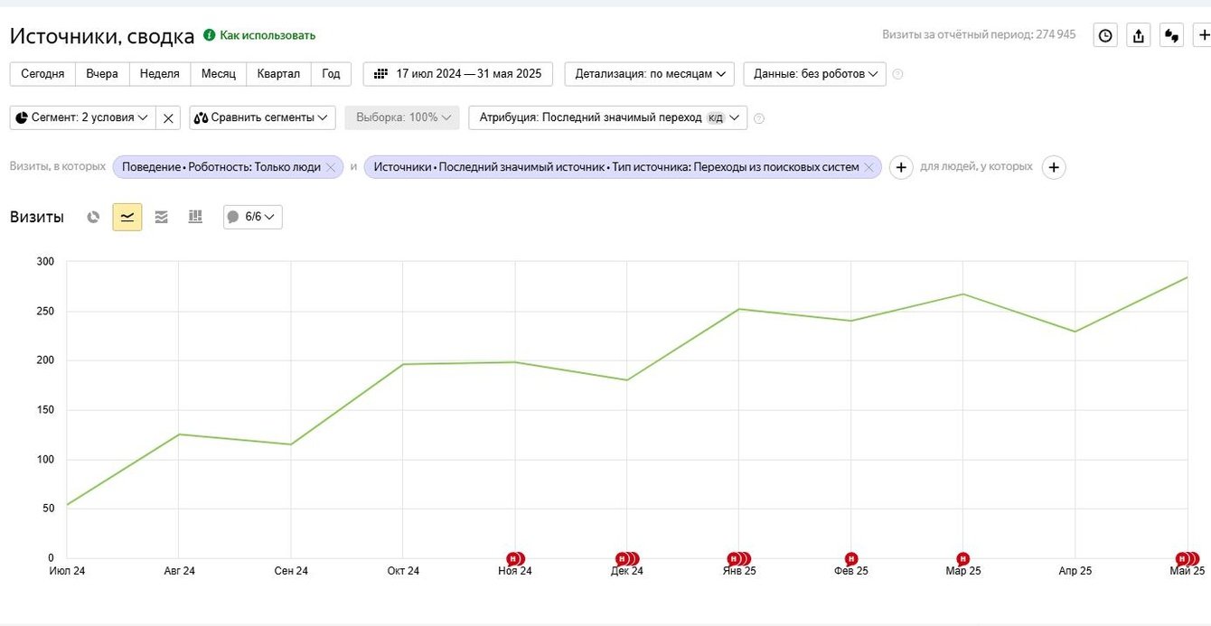 В результате комплекса работ по SEO-продвижению сайт типографии ПП РОСТ достиг значительного роста органического трафика за период 2024–2025 гг. Благодаря проработанной семантике, технической оптимизации и созданию качественных посадочных страниц удалось вывести сайт в ТОП по основным коммерческим запросам, привлечь стабильный поток трафика и получить сотни заявок от целевой аудитории.