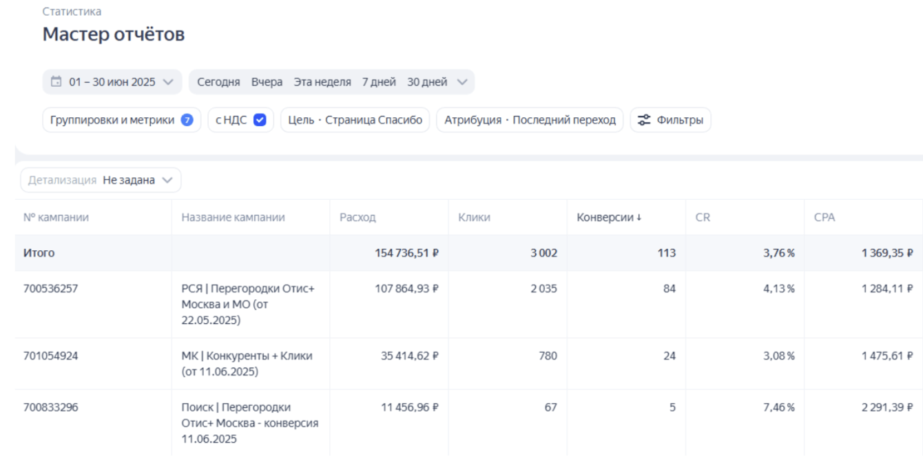 В июне 2025 года общий расход по всем кампаниям составил 154 736 рублей, а количество конверсий — 113.