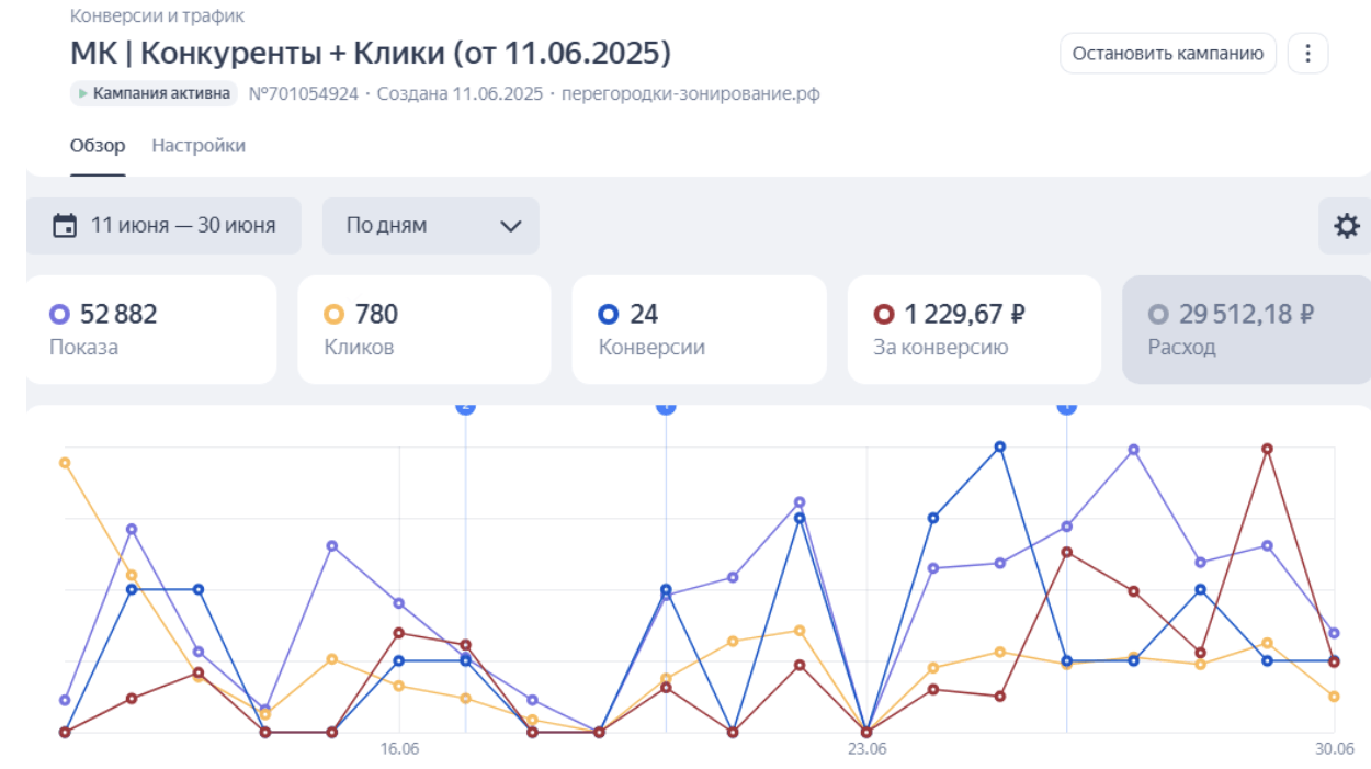 МК (Конкуренты + Клики): 24 конверсии при 780 кликах, CPA 1 476 ₽ — стабильная кампания с потенциалом оптимизации;