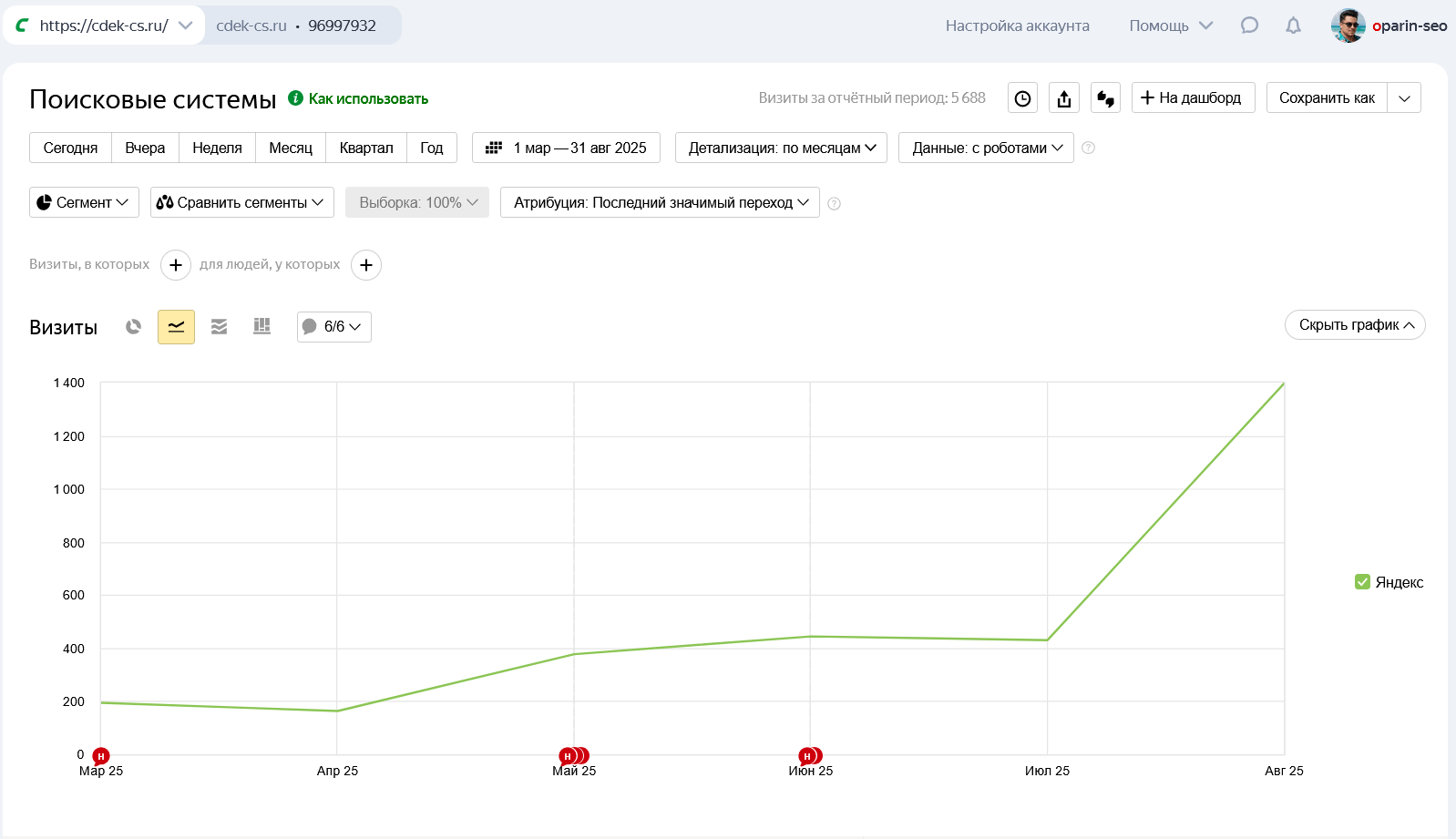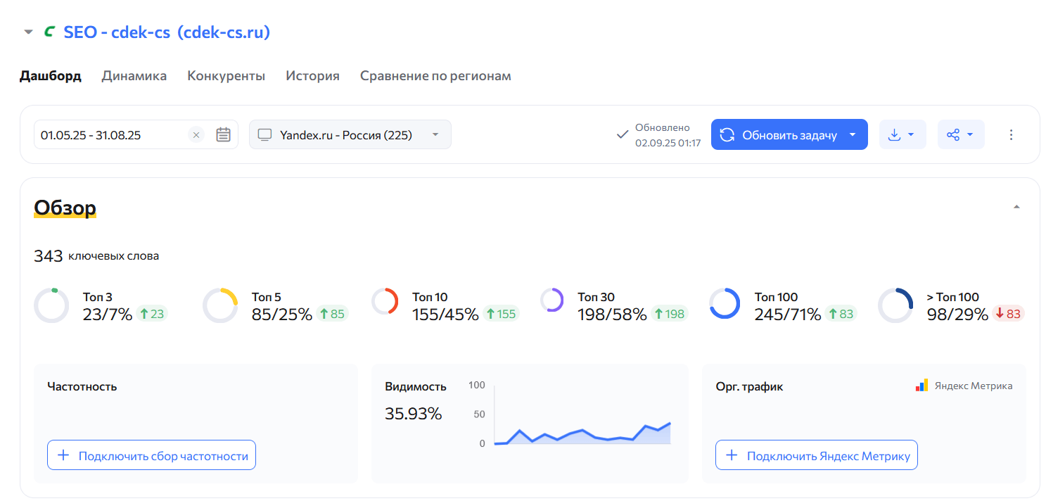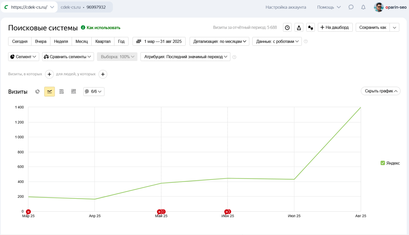 По позициям — прорыв именно по коммерческим направлениям. Страницы «доставка на маркетплейсы» и «доставка документов» закрепились в топ-10, и это сразу отразилось на заявках. В целом видимость выросла: чем полнее стала структура, тем проще поисковику понимать релевантность домена к теме СДЭК-доставки. Важный момент — рост был не «разовым», а ступенчатым: сначала — техподготовка, затем — контентные хабы, потом — усиление ссылками и вовремя внесённые правки по поведенческим метрикам.