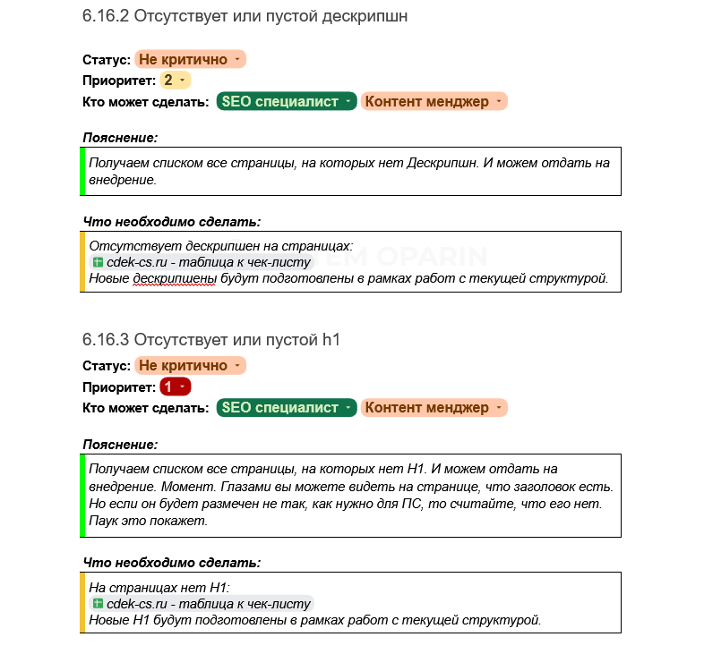 Отдельный блок — типовые страницы услуг. Им не хватало SEO-элементов, которые одновременно помогают пользователю: чёткой структуры заголовков, блоков с УТП, тарифной логики, мини-FAQ, триггеров доверия (про СДЭК, сроки, упаковку, безопасность), понятных CTA. Мы описали, что именно добавить и где это должно стоять. Разработчик внедрил — и каждая ключевая страница получила основу для ранжирования, а не только текст.