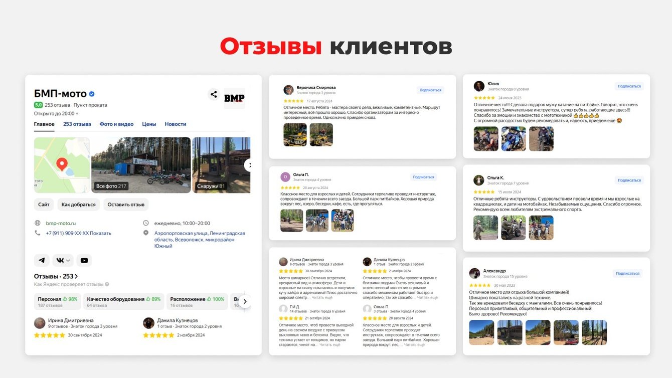 Ребята не просто взялись за рекламу, они помогли выстроить системную стратегию продвижения, благодаря которой BMP Moto вырос из небольшого проката на окраине Санкт-Петербурга в самый крупный эндуро-прокат города с тысячами клиентов. Они разработали нам сайт, запустили SEO, автоматизировали CRM, помогли с продвижением в соцсетях и вывели YouTube-канал в топ – и всё это в едином, продуманном ключе.