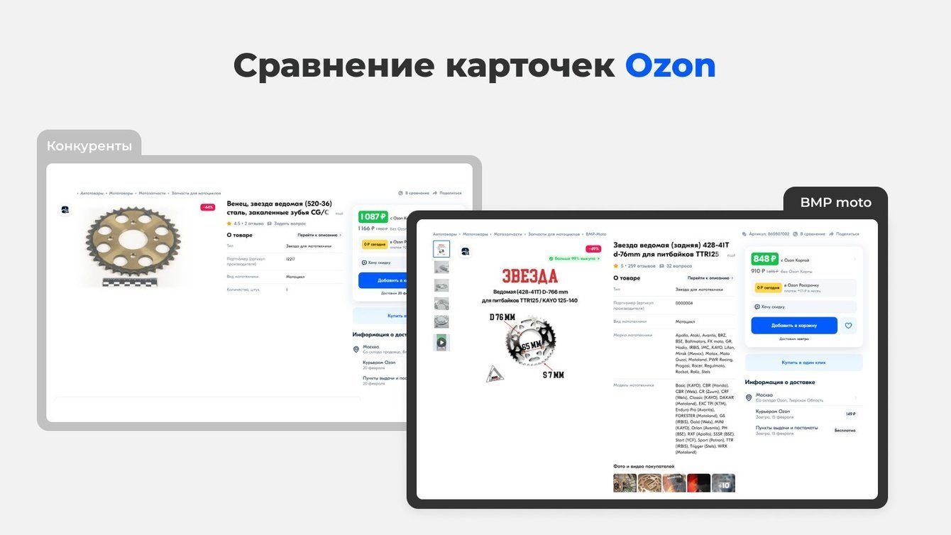 1. Тестирование на Ozon. Разработка ИМ — это довольно долгий и недешевый процесс. Было принято стратегическое решение выйти на маркетплейсы и протестировать гипотезу. Совместно мы сделали карточки небольшой партии товаров с собственными фото и детальным описанием. Качественная проработка карточек позволила обойти не только конкурентов, но и производителей мотозапчастей.