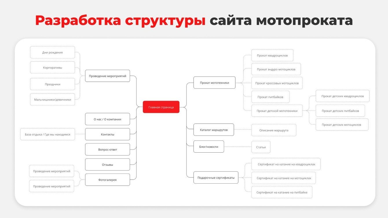 - Составили полную структуру сайта, от категорий мототехники до страниц отдельных услуг. Из одностраничного лендинга - мы сделали 50-ти страничный сайт услуг.