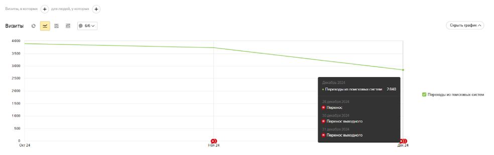 Компания из сферы пожарной безопасности пришла в OK Digital в декабре 2024 года с работающим сайтом, но нереализованным потенциалом. При среднем уровне посещаемости около 2 840 визитов в месяц и всего 57 запросах в топе пользователи редко доходили до целевых действий. Анализ показал, что мешали устаревшая структура каталога, технические ошибки и слабый контент в карточках.