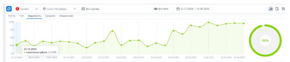 • 95,71 % запросов вывели в ТОП-10 по Санкт-Петербургу (на старте было 27,07 %);