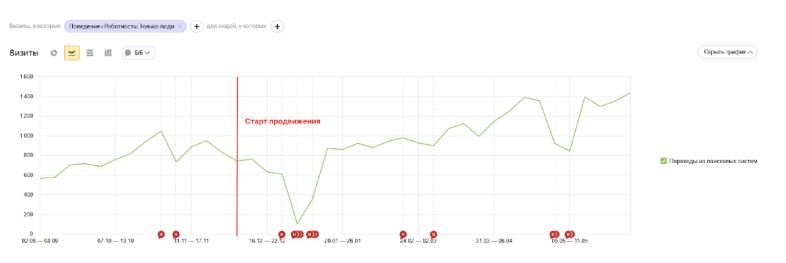 Мы обновили шапку и структуру страниц для корректного отображения на смартфонах, улучшили удобство взаимодействия. Это дало рост качества трафика: снизились отказы и улучшились поведенческие показатели — важный фактор для закрепления позиций в Яндексе.