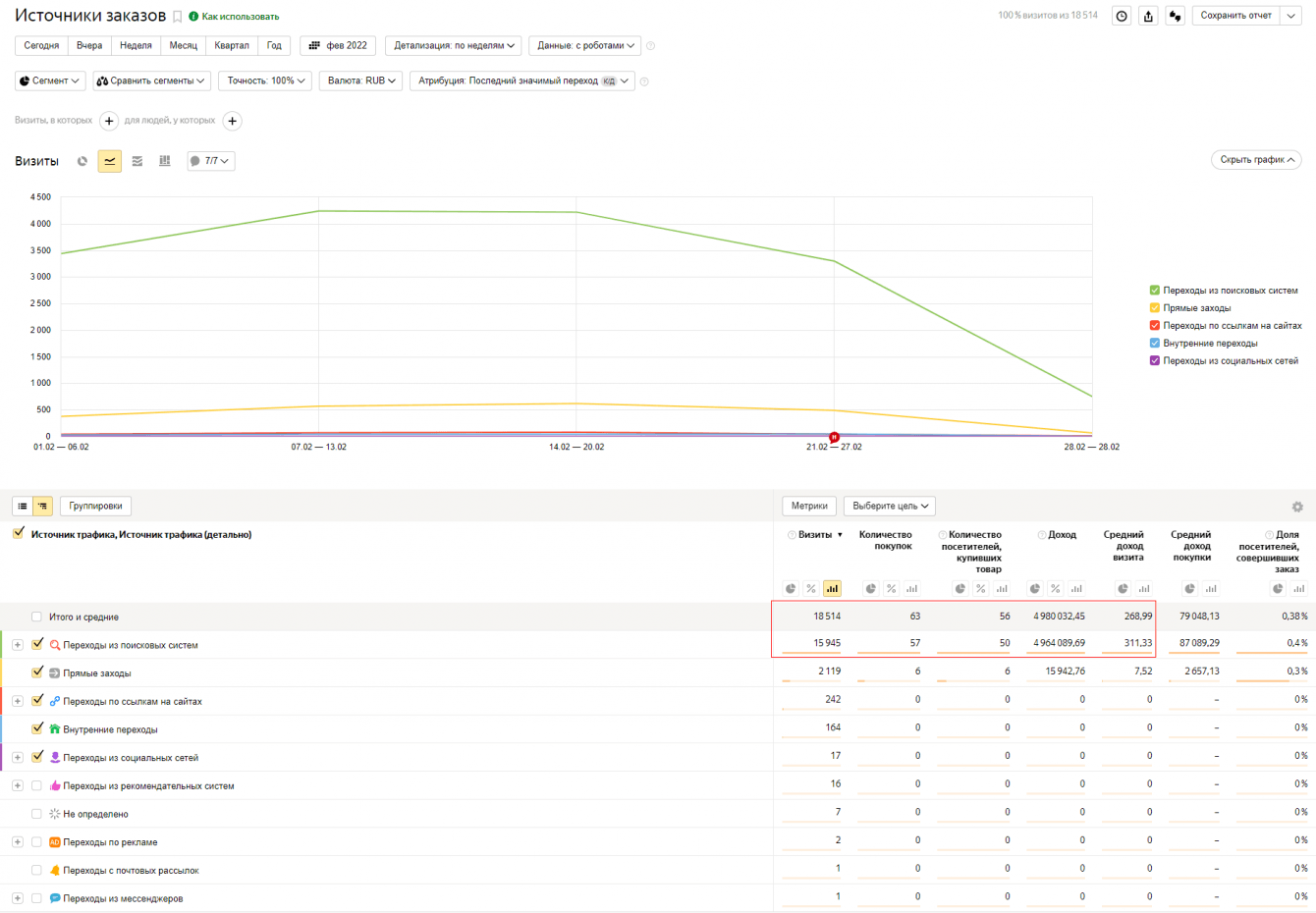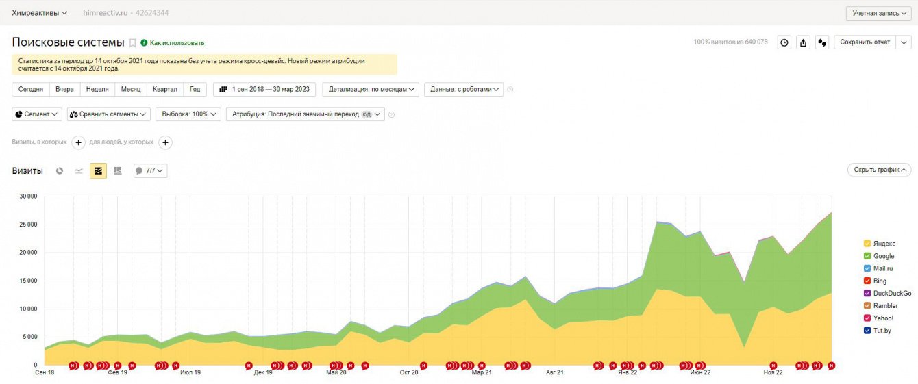 Доля поискового трафика составляла 68,7% в сентябре 2018, а в апреле 2023 составляет — 88,4%.