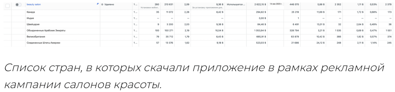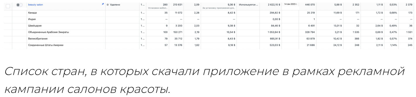 И это дало результат! Лучше всего себя показала кампания, нацеленная на салоны красоты: мы получили 280 установок по цене $9,36 за каждую.