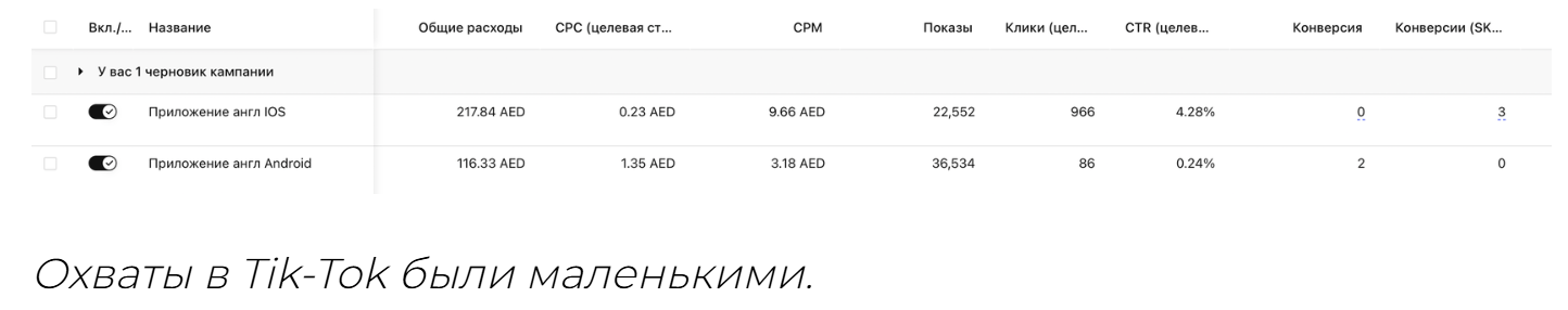 Мы попробовали зайти и в TikTok, но тестовый бюджет там закончился очень быстро. Стоимость лида оказалась высокой (72 AED на iOS и 58 AED на Android), а охваты — маленькими.