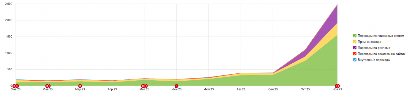 Периодичность публикации текстов, как и их количество, соответствовали внутреннему плану — это обеспечило преимущество перед конкурентами и долгосрочный успех в ранжировании сайта. Регулярные размещения статей помогали держать планку трафика и постоянно двигаться выше в поиске по необходимым запросам.
