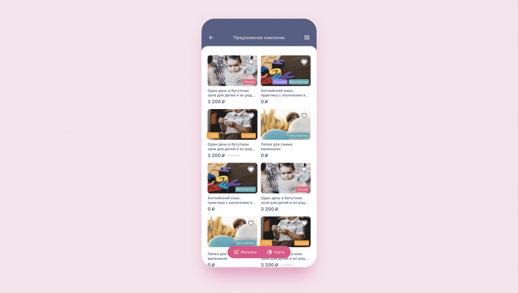 Разработка этого мобильного приложения задумывалась как “точка входа” для родителей, которым нужны товары и услуги для детей, а искать подходящее среди разбросанной по интернету информации времени нет. Главная фича приложения — поиск организаций, которые предоставляют услуги для детей: от аттракционов с батутами до детских садов и спортивных секций.