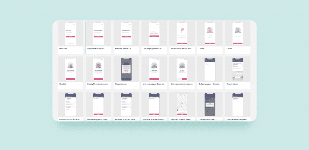 Архив с родительскими сценариями — это 600 скринов неупорядоченных действий в сервисе, архив с организаторскими сценариями — это 400 аналогичных хаотичных скринов. Каждый раз, когда нам нужно было что-то поправить, мы выискивали конкретные скрины, отправляли их дизайнеру и ждали исправлений.