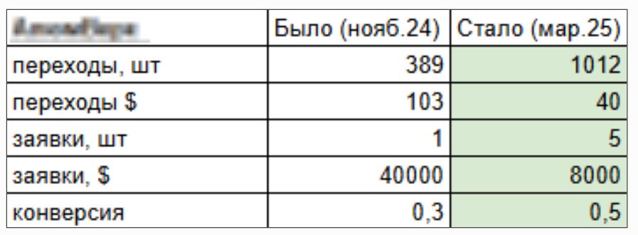 Количество заявок также увеличилось, а их стоимость сократилась в 5 раз. Хоть она и составляла 8 000 рублей, но для ниши клиента цена хорошая.