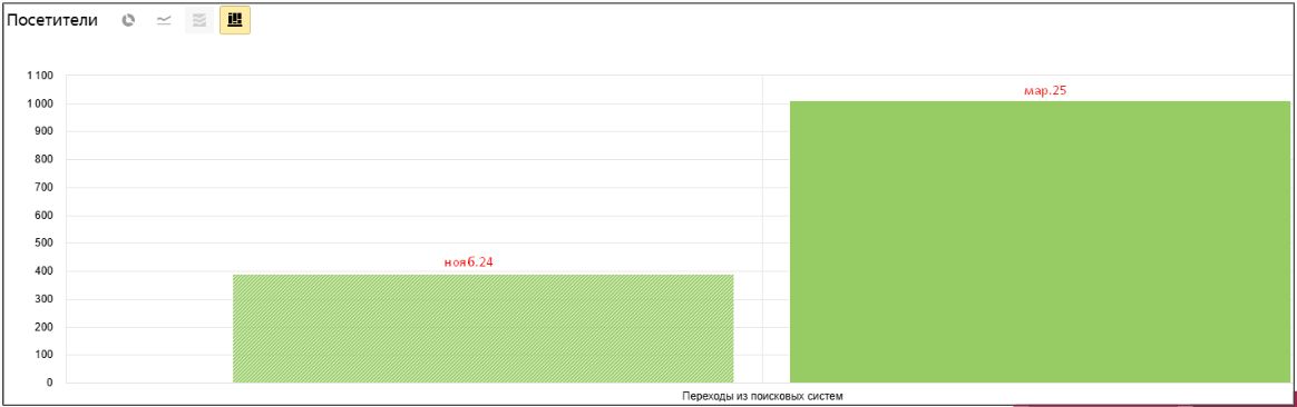 За 4 месяца мы увеличили небрендовый трафик на сайт в 2,6 раза. Для сравнения, в ноябре было 389 переходов, а в марте – уже 1012. Это важный показатель, поскольку он отражает переходы пользователей по запросам, не связанным с названием конкретной компании или продукта (например, “купить теплицу”). И именно от небрендового трафика зависит привлечение новой аудитории, которая раньше даже не слышала о нашем клиенте и его продуктах.