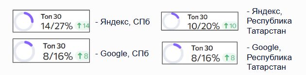 При этом выросли не только показатели, но и позиции сайта в поисковых системах: по Ленинградской области мы вывели 14 запросов в ТОП-30 Яндекса и 8 запросов в Google, а в Республике Татарстан – 10 запросов в ТОП-30 Яндекс и 8 запросов в Google.