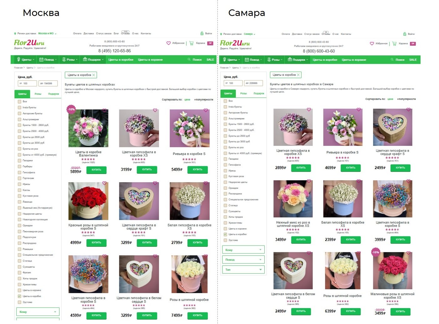 Мы создали на каждой странице свой набор товаров. Например, в Москве и Самаре клиент продает одинаковые букеты, но по запросу «Букет в коробке» выводятся страницы с разным набором товаров.