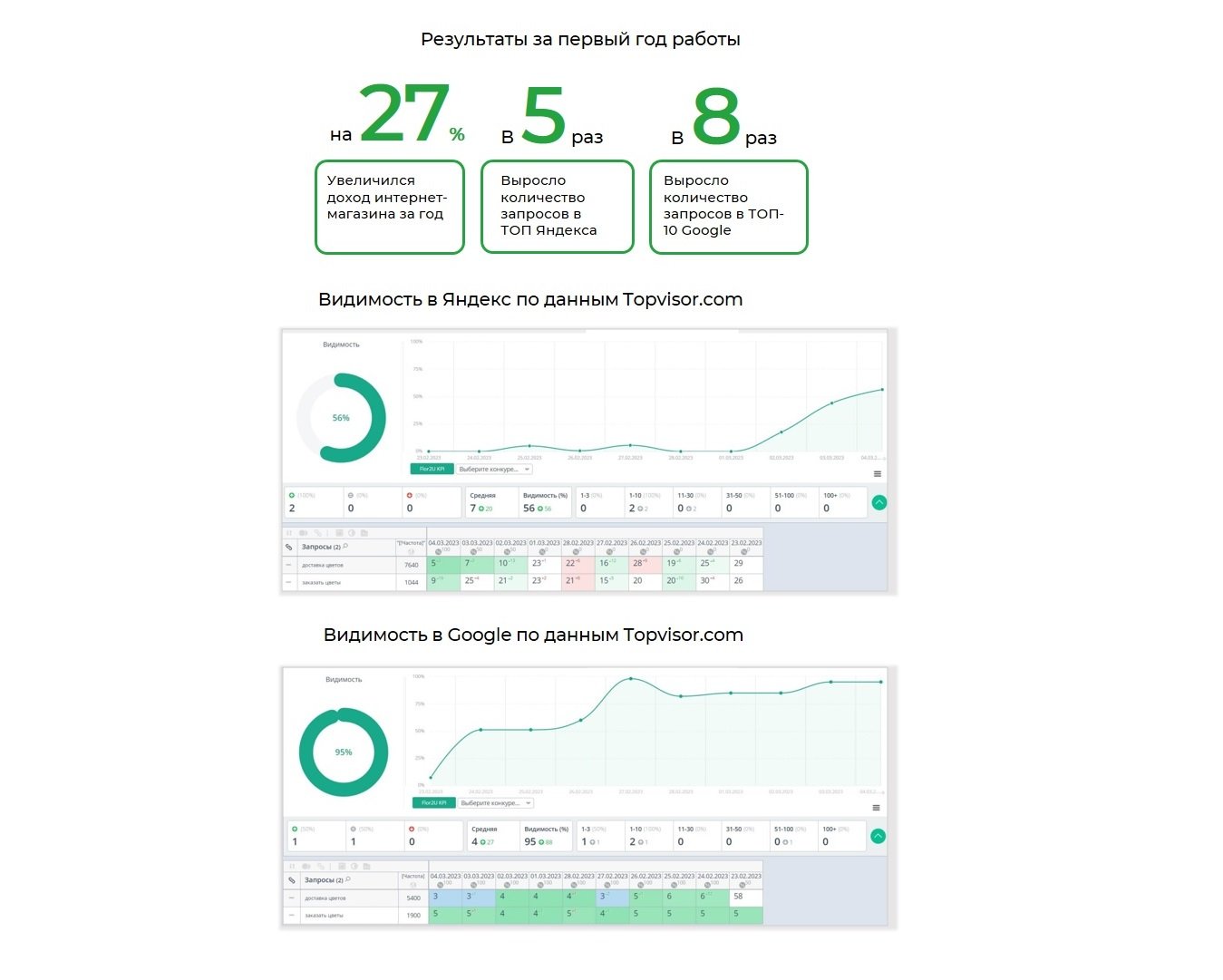 Эффект не был мгновенным. Но, совокупно, наши усилия дали хороший результат за первый год работы. На протяжении трех лет видимость сайта и количество заказов с SEO постоянно растут. Сегодня Flor2u успешно продает букеты в 160 регионах России.