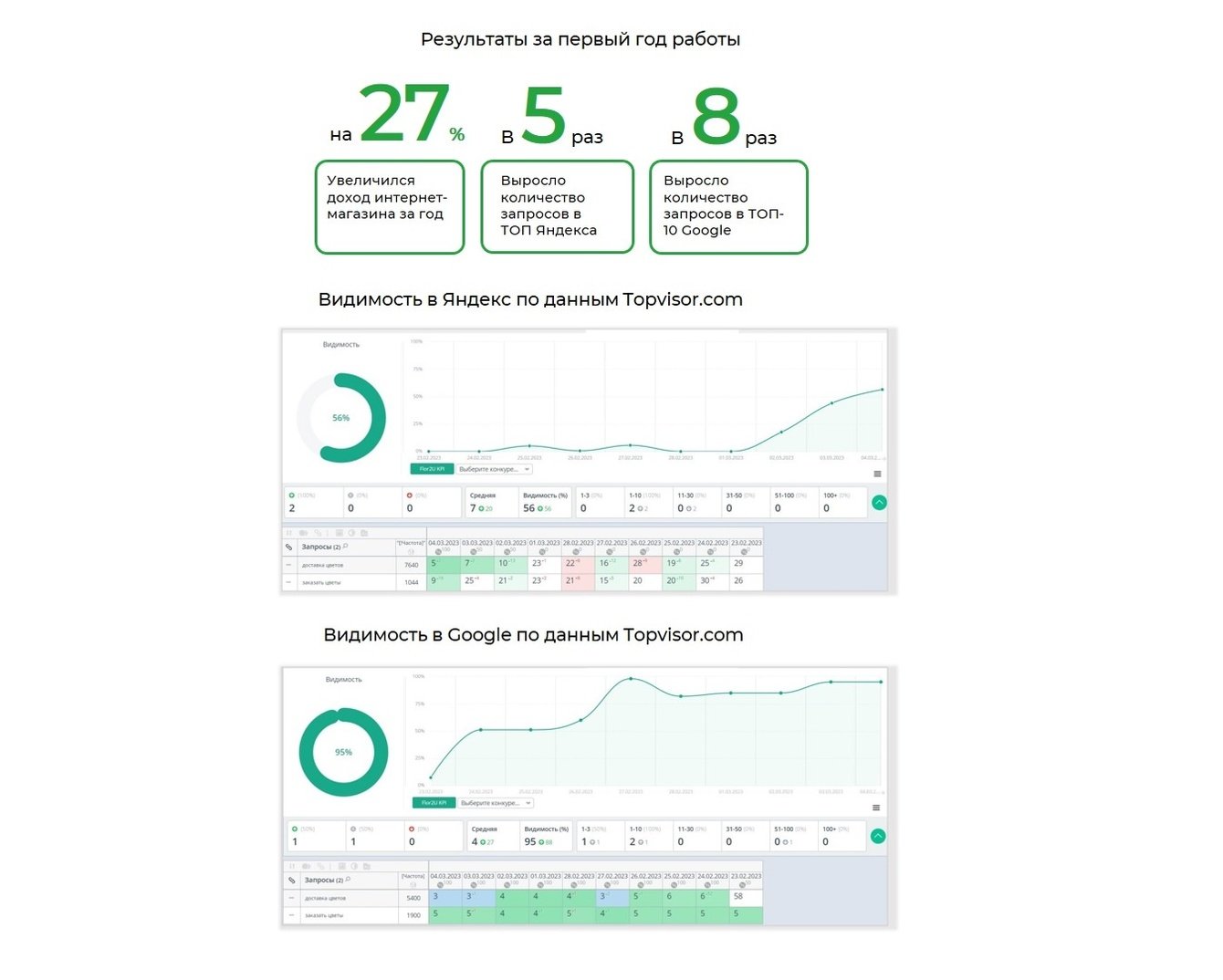 Уже за первый год работы доход интернета-магазина вырос на 27%, в основном, за счет роста позиций по средне- и низкочастотным запросам.