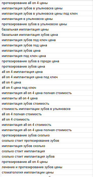 Главное правило в сборе семантики: никакой информационной воды. Только коммерческие запросы, только хардкор. Например, запросы типа «сколько стоит удалить зуб» или «сколько стоит имплантация зубов» — это то, что нам нужно. А вот «как лечить зубы у детей» — нет, спасибо, это для блога, а не для Директа.