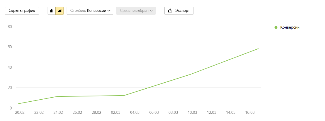 Результат превзошел наши ожидания: на пятой неделе мы получили уже 67 заявок. Цена конверсии продолжала падать, достигнув отметки в 1200 рублей.
