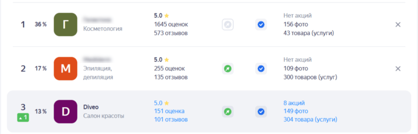 1) В апреле 2025 салон занял 4-е место среди конкурентов в категории «Косметология», и уже в мае был на 3 месте.