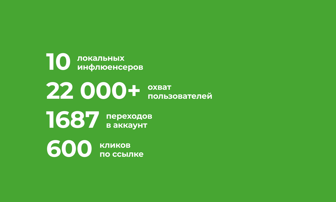 Благодаря сочетанию классного предложения от зоомагазина и экспертности агентства в influence-маркетинге удалось за неделю посотрудничать с 10 блогерами, охватить более 22 000 человек, набрать 1687 переходов в аккаунт и 600 кликов по ссылке.