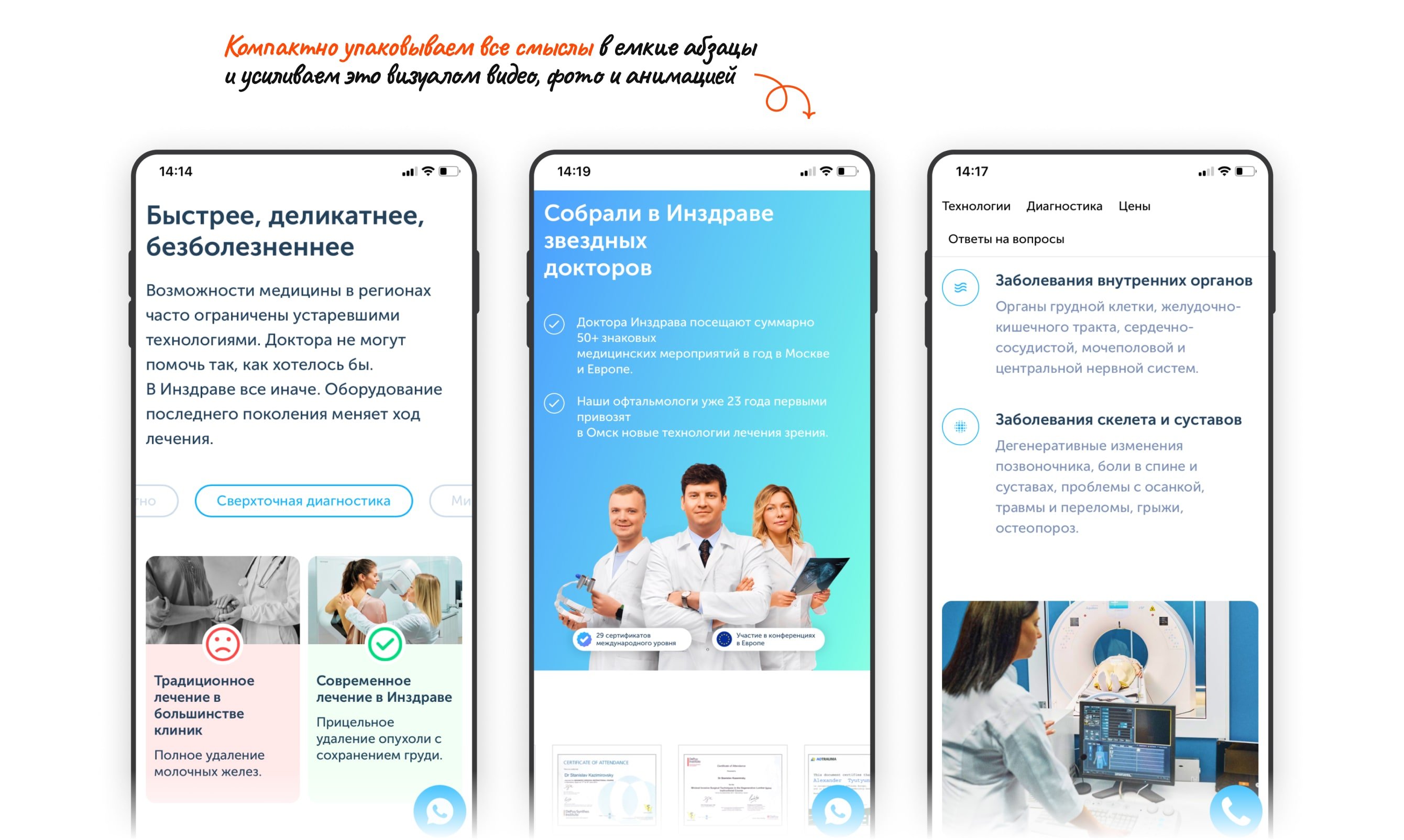 Mobile first. По опыту наших проектов в медицине мы уже знали, как сейчас распределяется трафик. Взять ту же офтальмологию. Три года назад 80% пользователей просматривали сайты с экранов компьютера, а сейчас все наоборот: столько же пользователей заходят уже с телефона. Никому не интересно читать полотна текстов.