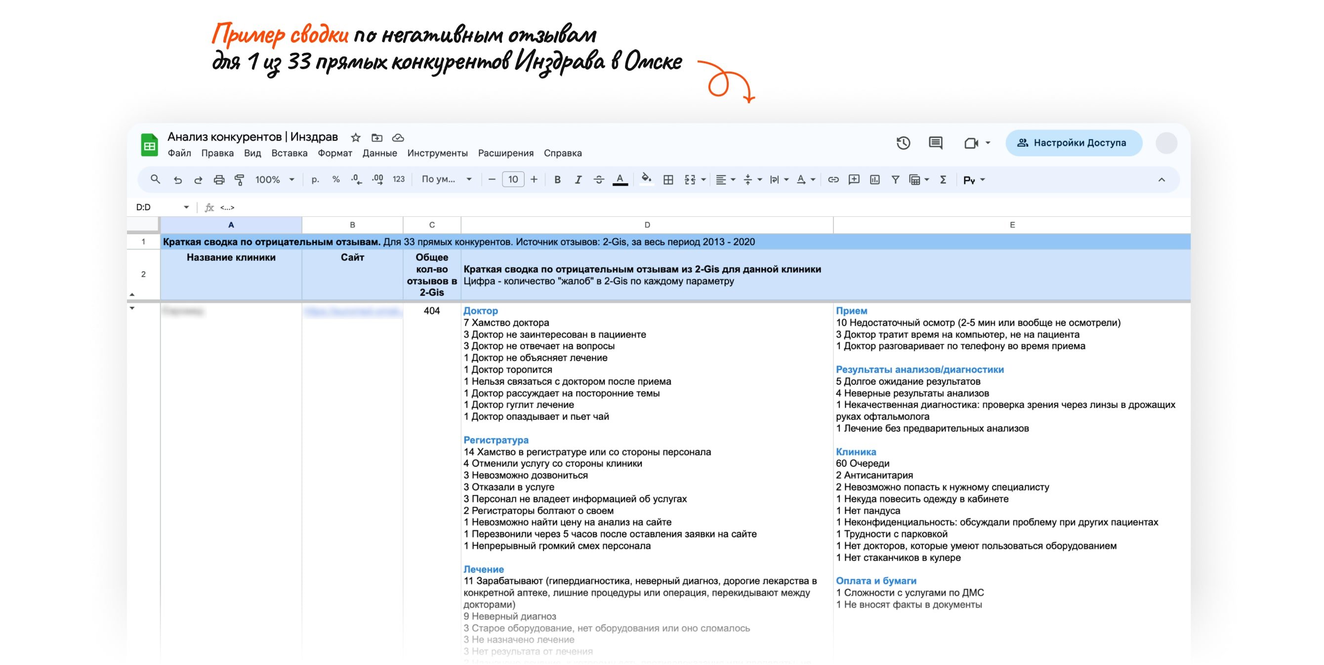 Выделили 11 категорий негативных отзывов, связанных с доктором, регистратурой, связью с клиникой, лечением, приемом, результатами анализов и диагностики, персоналом, чистотой, оплатой и клиникой в целом. Так удалось получить развернутую цифровую оценку каждого конкурента.