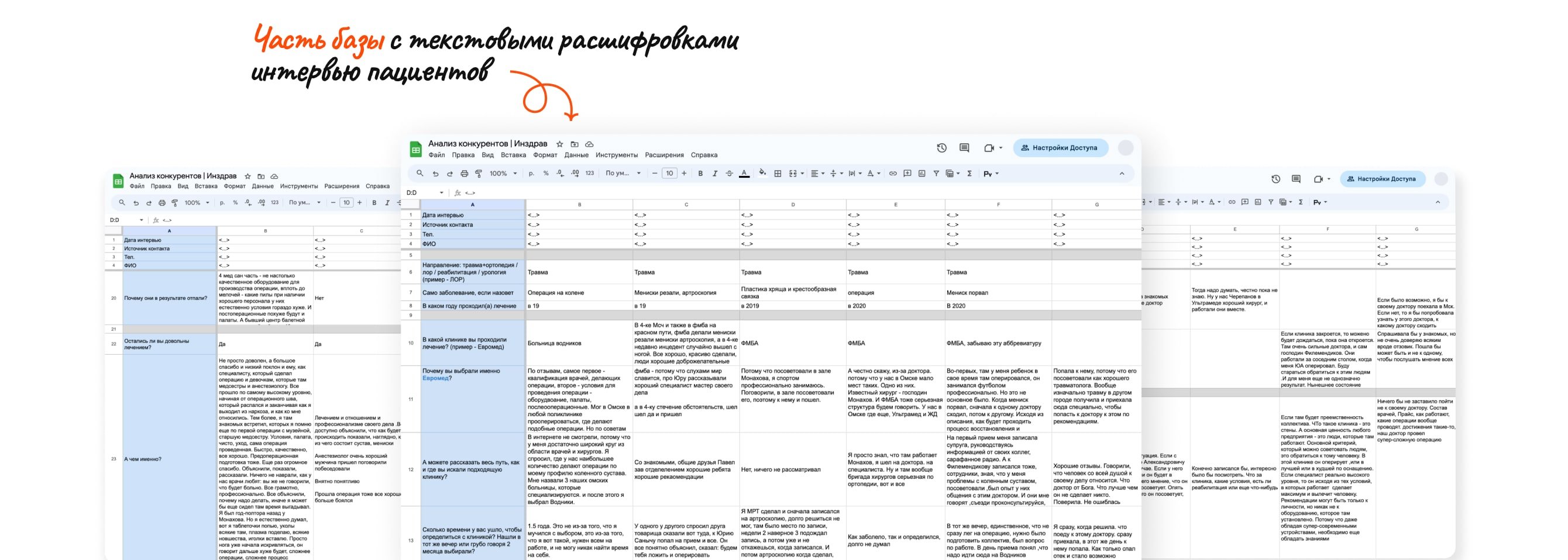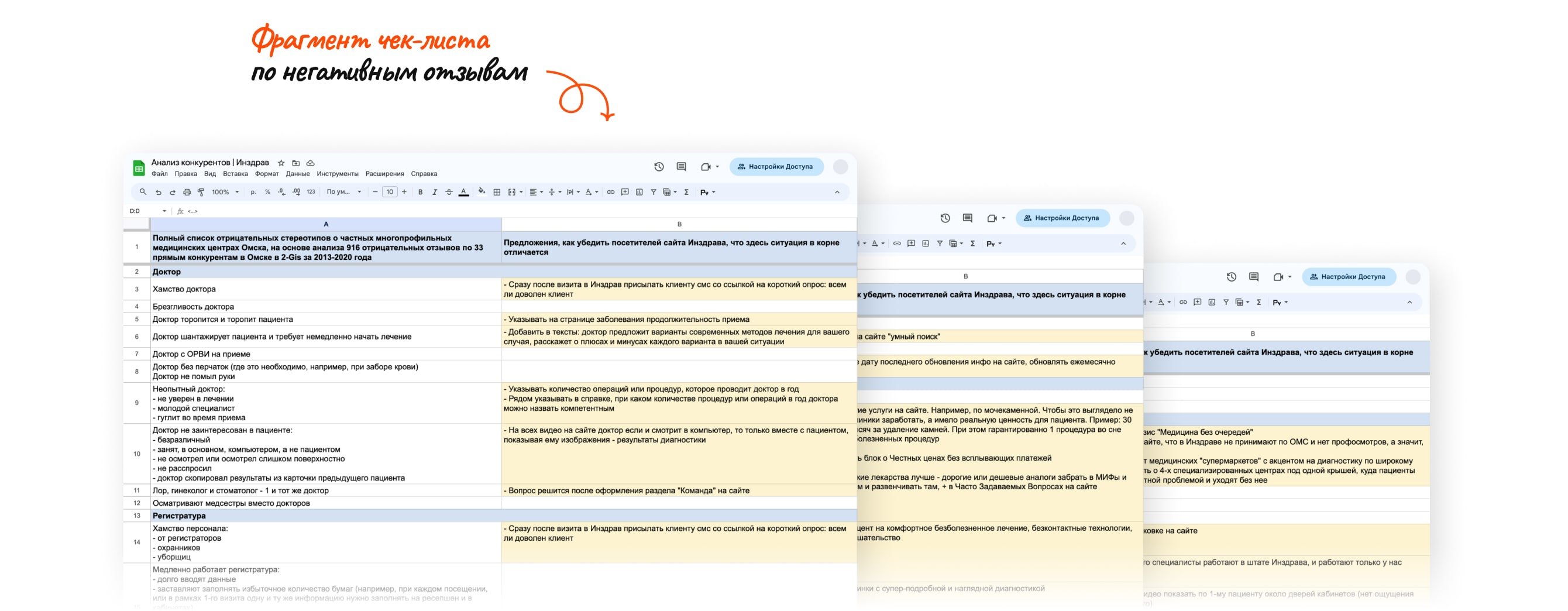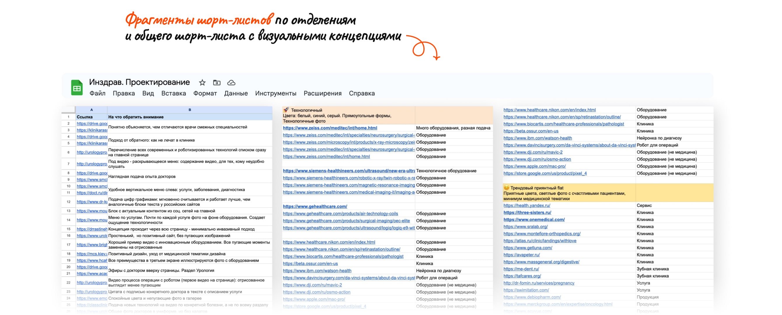 К этому этапу мы подошли с огромным массивом данных — 20+ гугл-доков с исследованиями конкурентов и других медицинских сайтов.