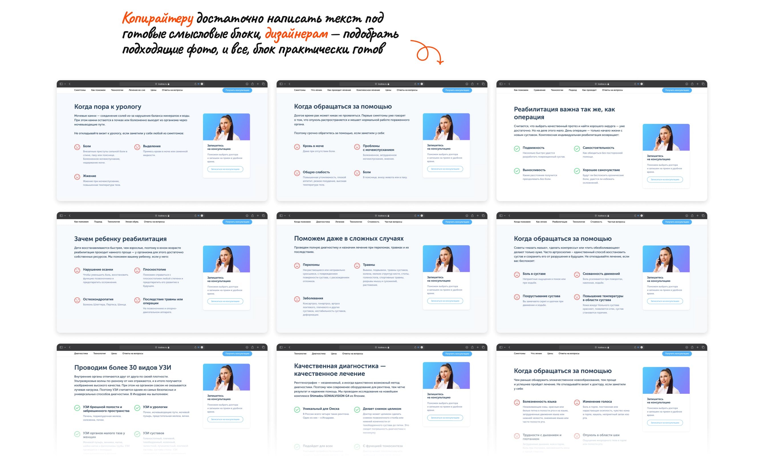 — Создать уникальные варианты подачи лендингов услуг и страниц докторов