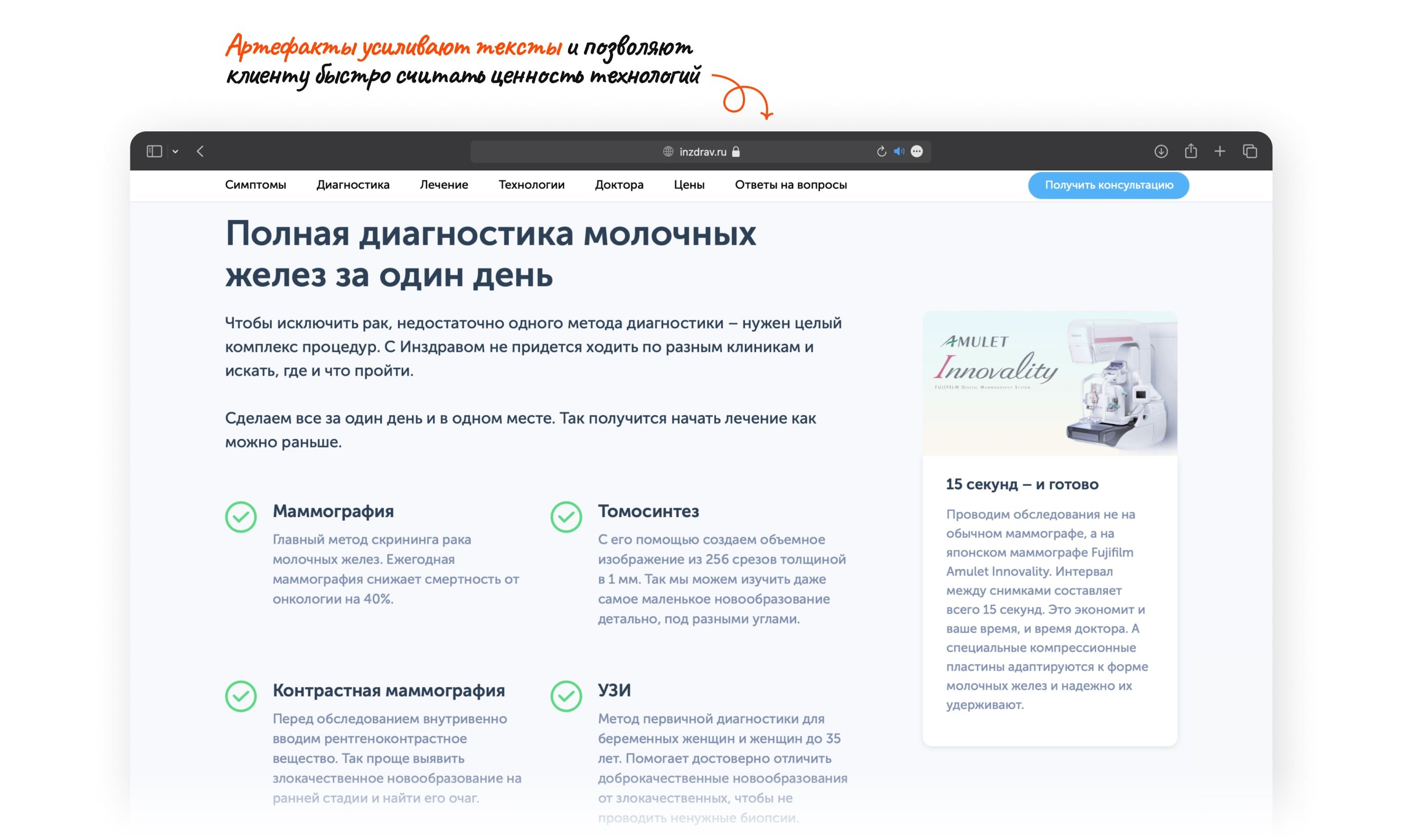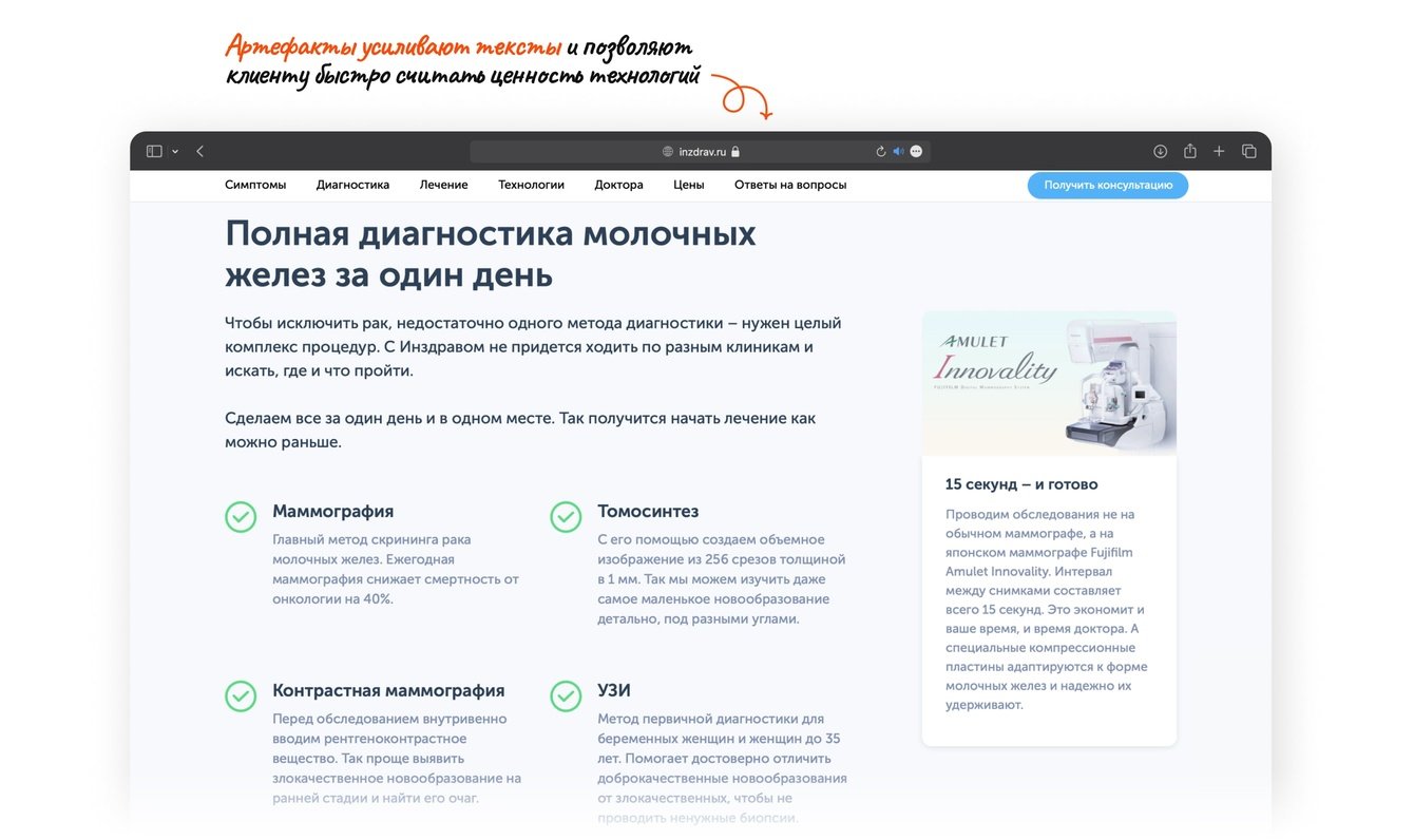 400+ идей для сайта Инздрава. На прямых конкурентах мы не остановились. Анализ только своего города дает лишь кратковременное преимущество. Чтобы выиграть на длинной дистанции, мы искали лучшие референсы среди частных клиник и в России, и за границей.