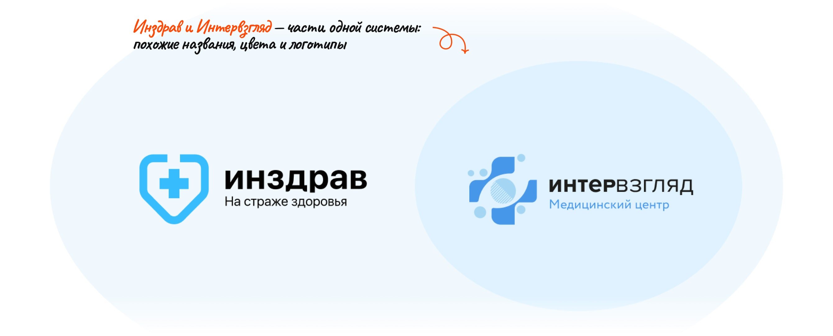 Цвета, название и логотип. Инздрав не появился на пустом месте. У клиники был предшественник — офтальмология «Интервзгляд», которая после запуска Инздрава должна была стать его частью. Поэтому было важно, чтобы дизайн двух клиник перекликался.