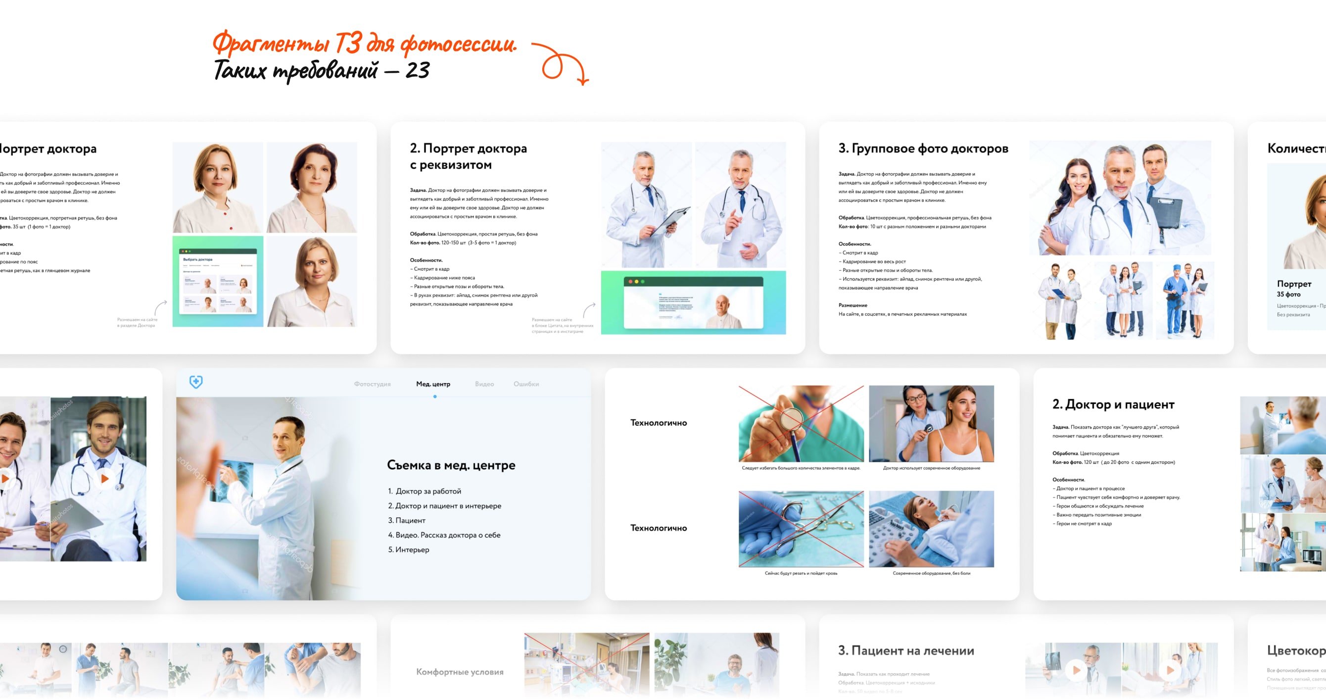 Три месяца подбирали и сводили в один документ референсы для фотографий. Для нас были важны несколько требований: минимум деталей, доктора выглядели приветливыми, а клиника — светлой, технологичной и эстетичной.
