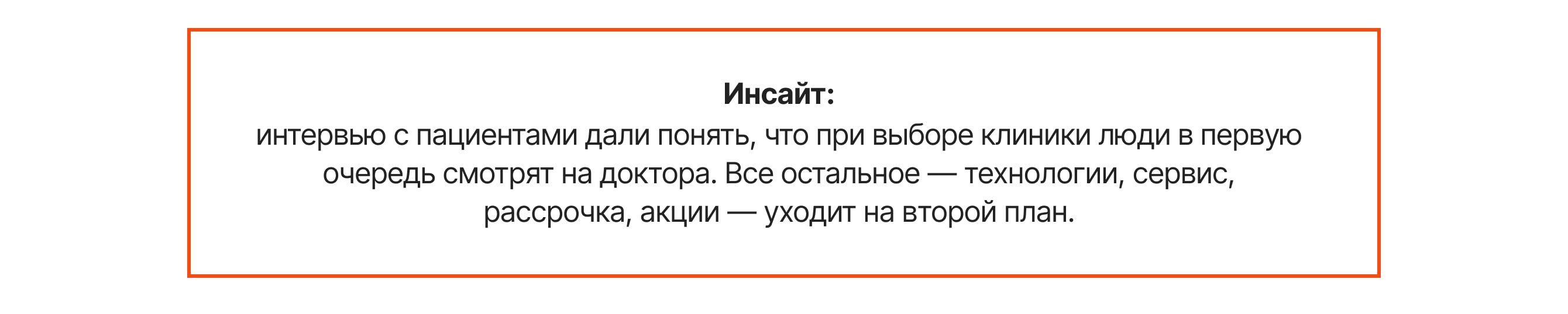 Работу начали с большого исследования и серии интервью. Для этого поговорили с руководителем клиники, главным врачом, поставщиками оборудования, докторами, пациентами из других клиник и бэк-офисом клиники.
