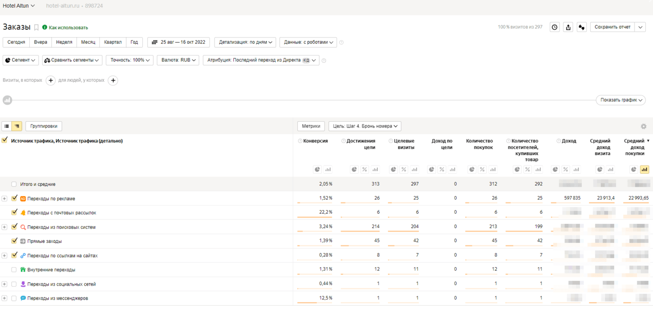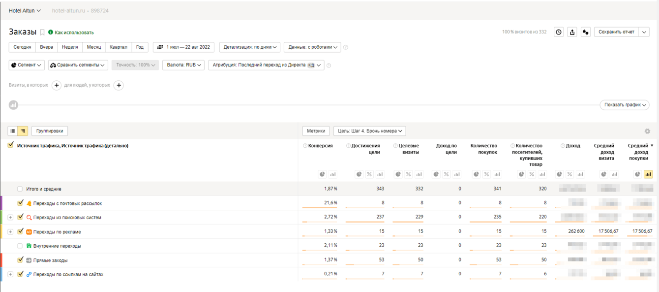 1. Нежелание клиента оплачивать дополнительные сервисы по настройке веб-аналитики. На сайте было 3 формата лидогенерации: бронирование номера, заявка на бронирование (если в нужные даты появляется номер, гость получает уведомление на почту с возможностью сразу забронировать) и звонок. Отслеживание последних 2х форматов требовали дополнительных финансовых вложений;