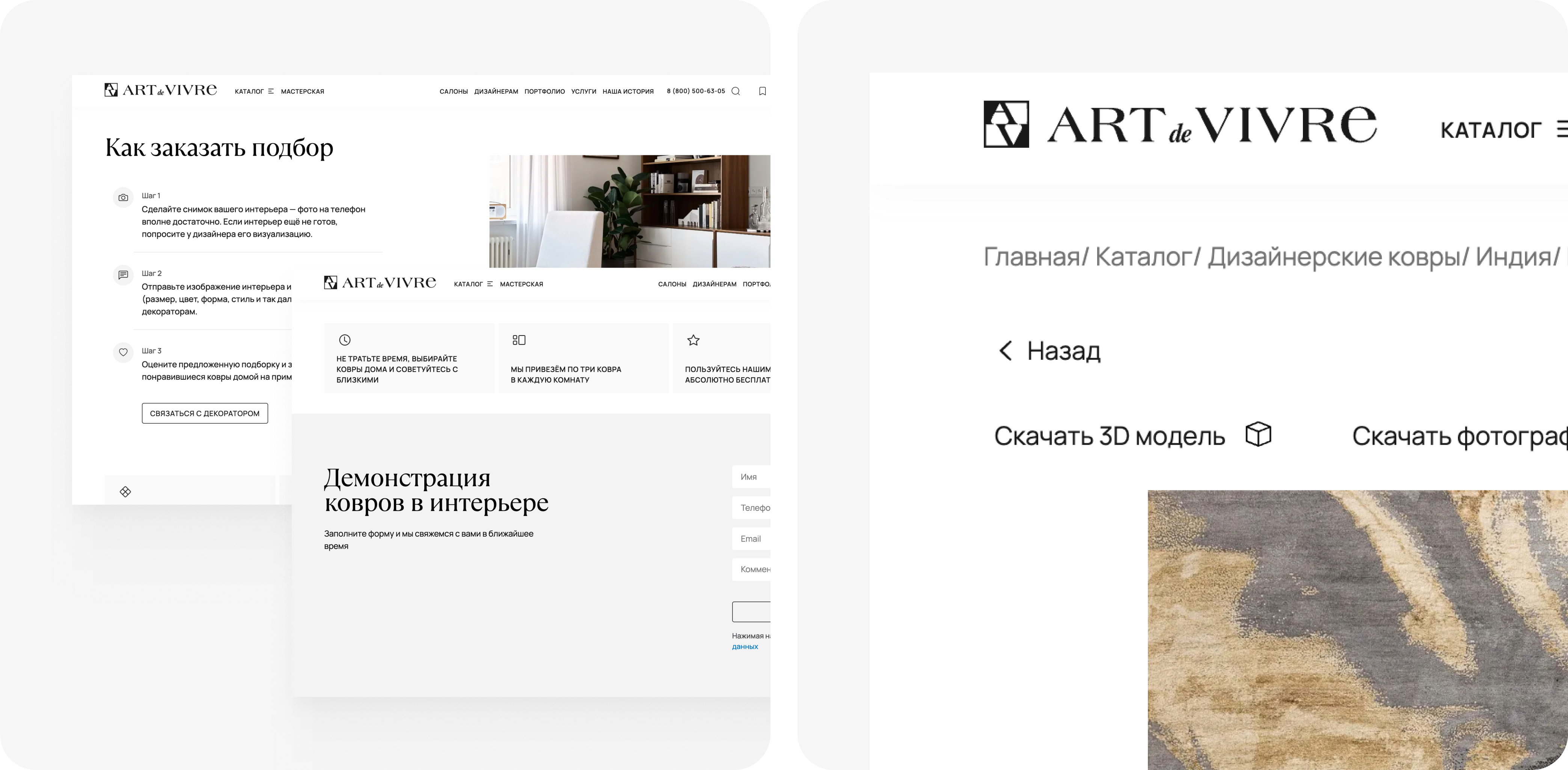 Понимая специфику спроса, компания kover.ru разработала эксклюзивный дочерний проект Art De Vivre. Он нацелен на взаимодействие с покупателями премиальной ковровой продукции. Выполнена отстройка от масс–маркета — сделана ставка на роскошь, уникальность, индивидуальность. Но как начать продавать ковры за миллионы, даже если уже все подготовлено: начиная от каталога и заканчивая продуманной доставкой? Ответ прост: выходить в онлайн, запустив продающий сайт и выстроив эмоциональную связь с целевой аудиторией. Именно эти задачи мы и взяли на себя. Какие решения были найдены — расскажем ниже и в деталях.