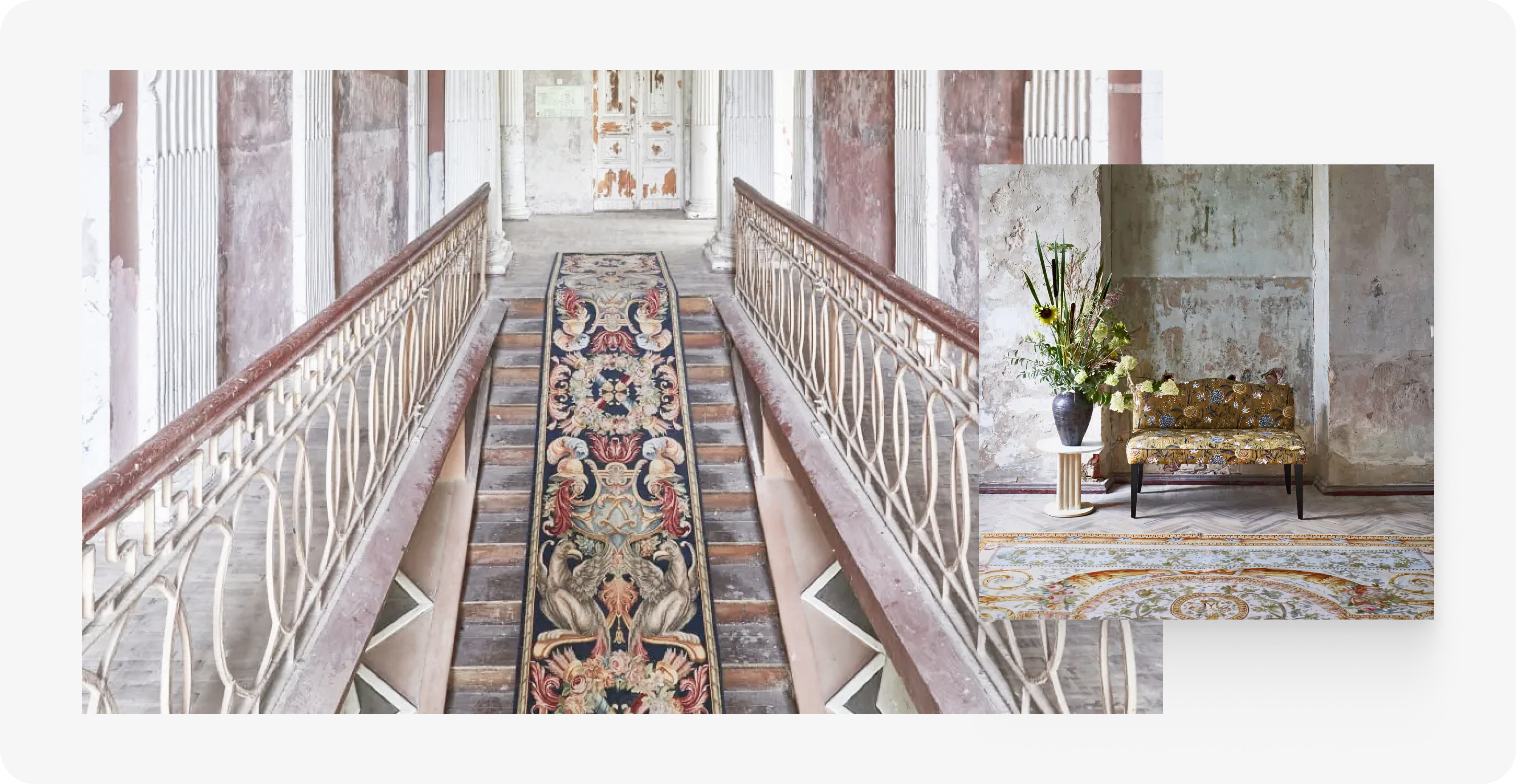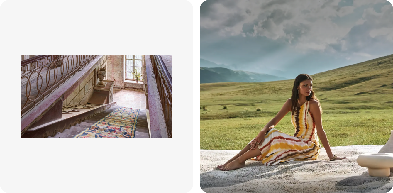 • Есть рекламная презентация с визуализацией: например, демонстрация того, как могут сочетаться ковры с разными концепциями изысканных интерьеров.