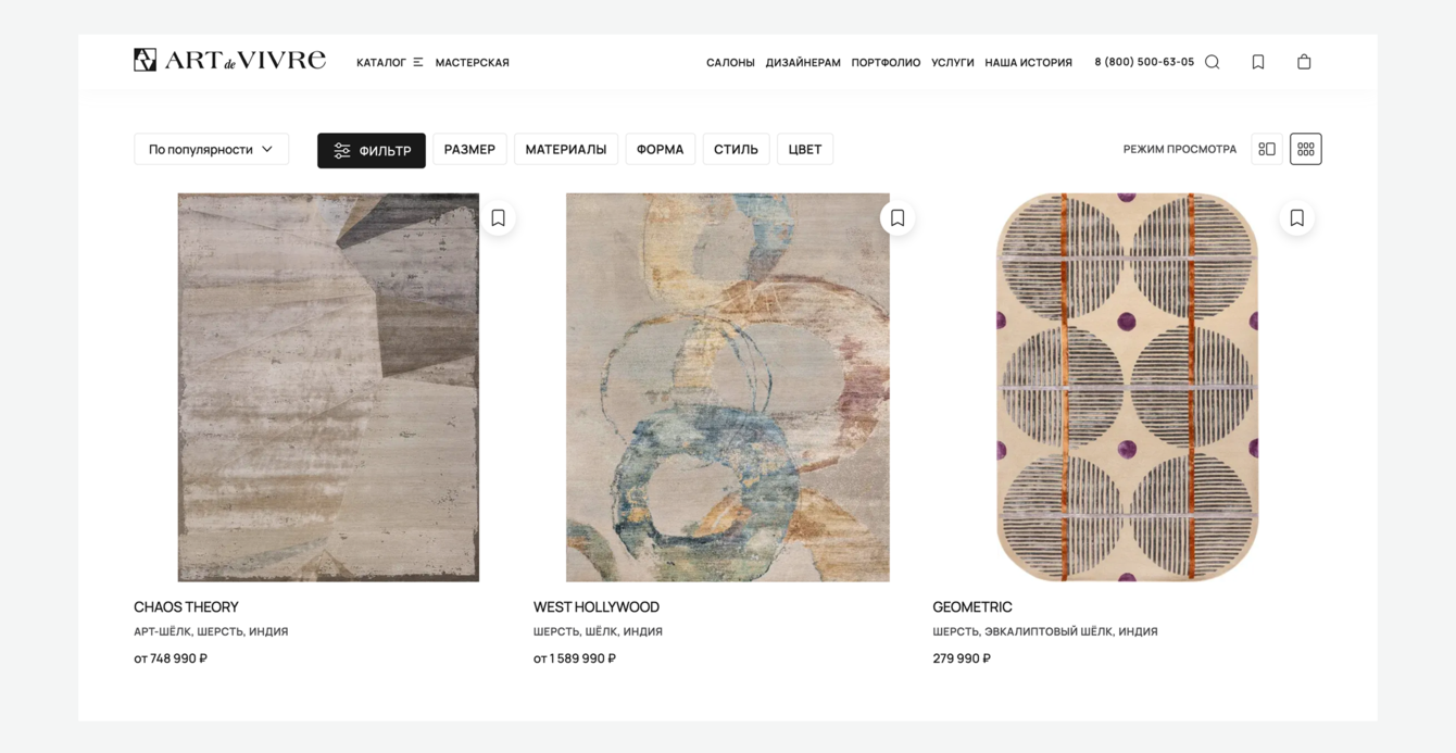 Для более скоростного создания SEO-страниц разработали скрипты, которые автоматически генерируют эти страницы с учетом параметров товаров. На сайте есть страницы с разными характеристиками ковров, что позволяет привлекать больше целевого трафика и повышать сайт Art De Vivre в поисковой выдаче.