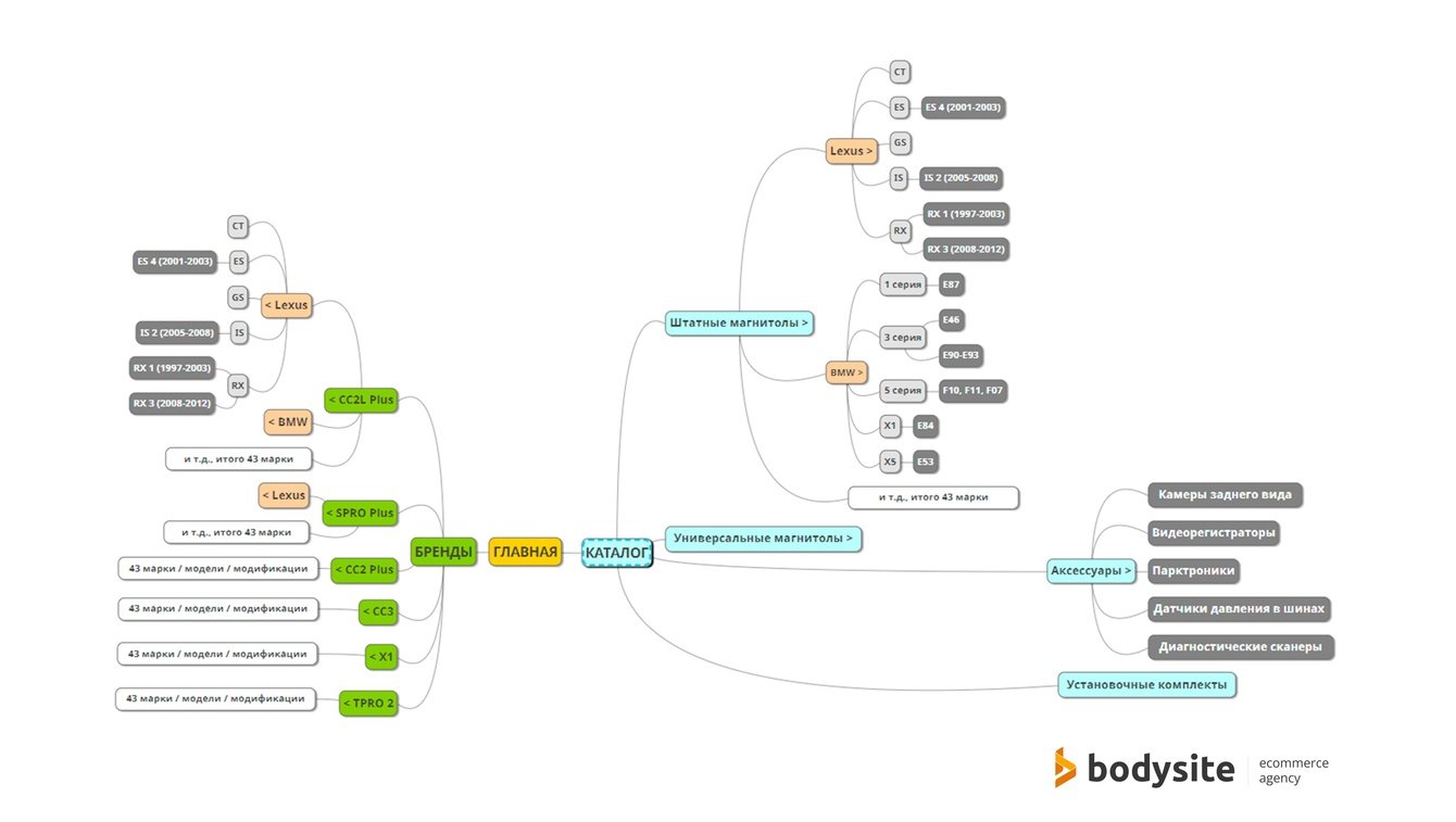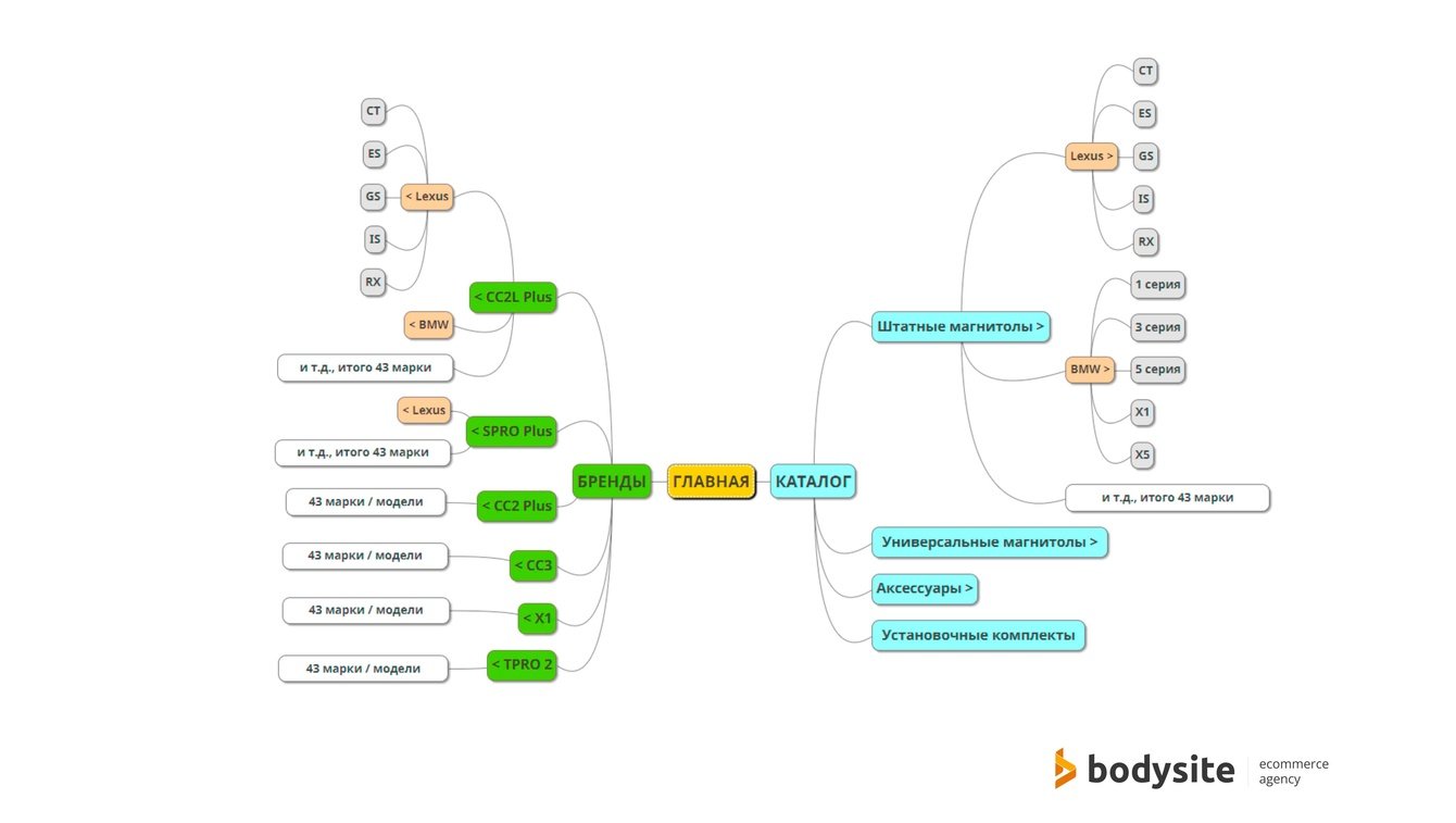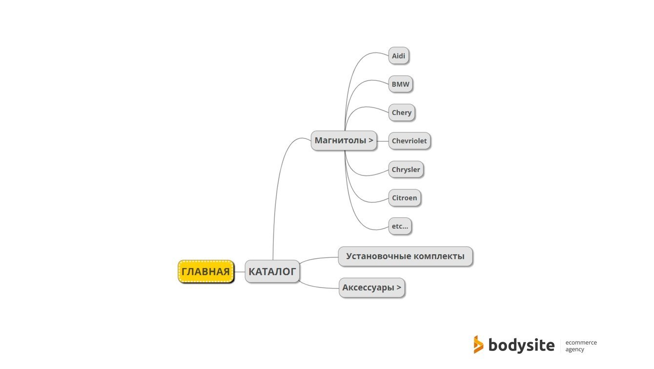 А вот для посетителя сайта универсальность модельного ряда совсем не очевидна. Запросы пользователей по большей части выглядели так: «марка + модель авто/модификация + модель магнитолы», на которые нам нужно ответить. Поэтому мы углубили структуру, добавили деление по моделям авто и сделали эту классификацию приоритетной. И да, в каждой из этих групп могли быть одни и те же товары. К моменту запуска сайта доработали структуру до такого вида: